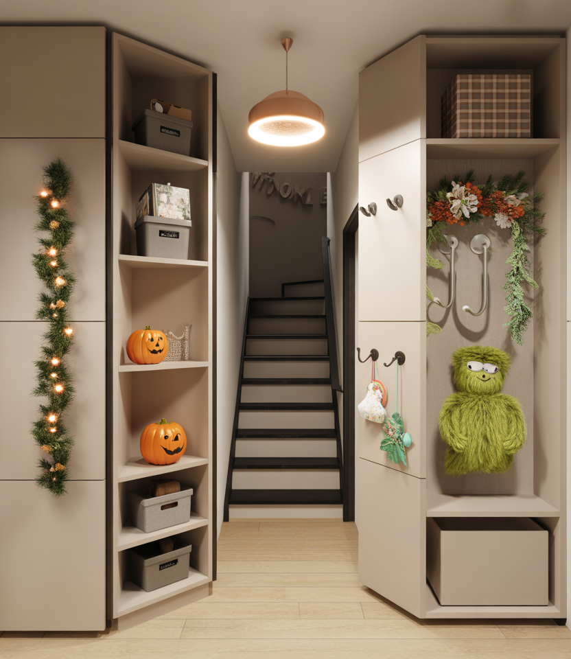 A rotating décor zone turns the entry or stair landing into a seasonal showcase—Christmas, Halloween, spring florals, or even a quirky Grinch moment. I know a family who keeps one wall as their “swap spot,” and it keeps the home feeling fun and current. Great for busy households wanting freshness without constant redecorating.