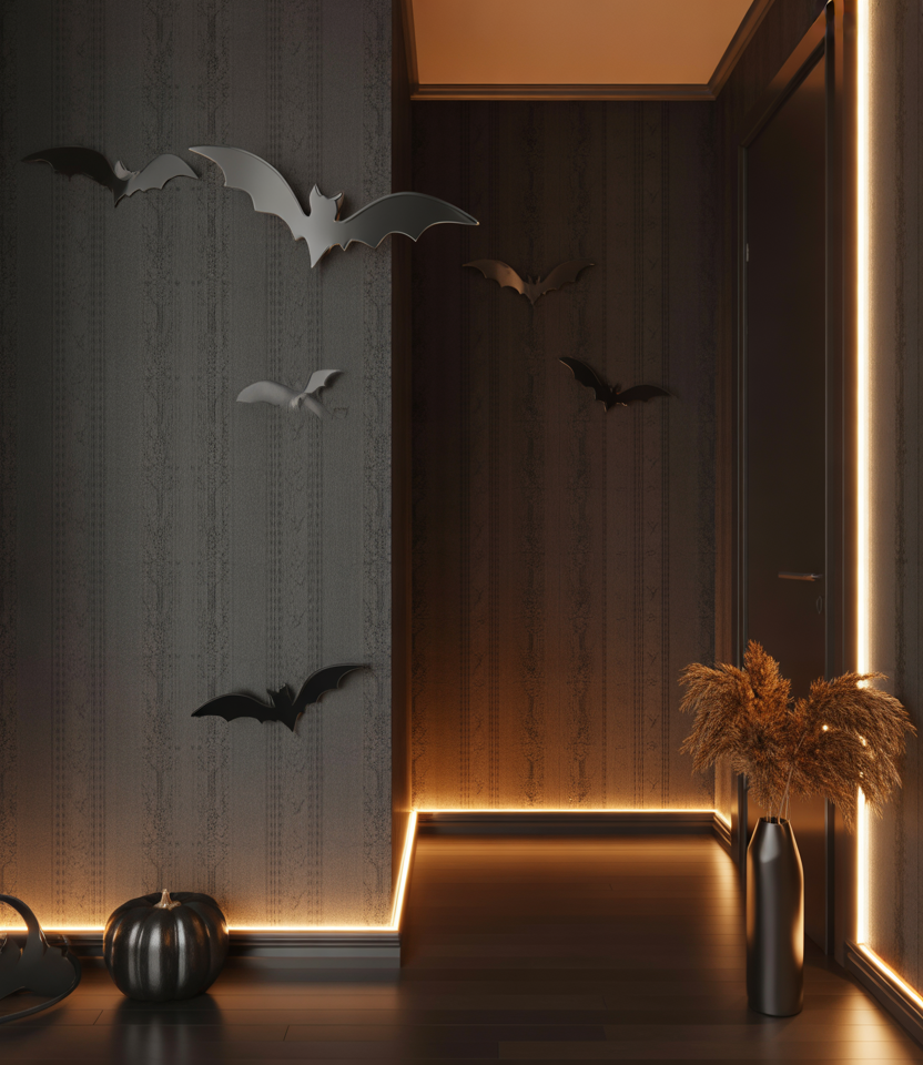 A moody October theme turns a bland corridor into a delightful Halloween experience. Think dim lighting, textured wallpaper, and minimalist bats rather than clutter. I once lined a short rental hallway with removable decals—quick, cheap, and unforgettable. This idea suits home entries, school celebrations, or themed classroom corridors that want seasonal character without being scary.