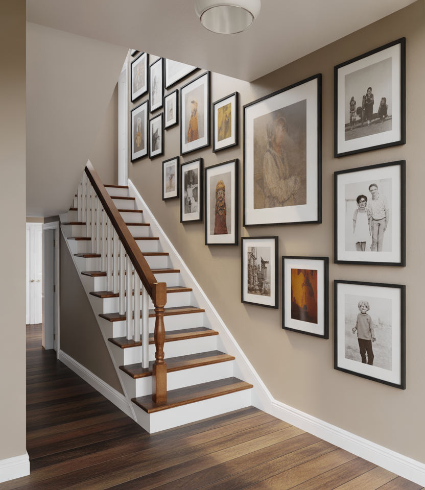 The upstairs stair hallway is perfect for a curated gallery wall. Sleek frames, balanced spacing, and warm tones suit 2026’s “curated but calm” trend. I helped a neighbor arrange family photos on a tricky angled wall, and it became the home’s emotional centerpiece. Great for home transitions, loft apartments, or any multi-level layout needing charm.