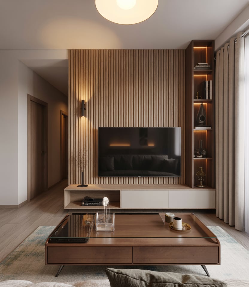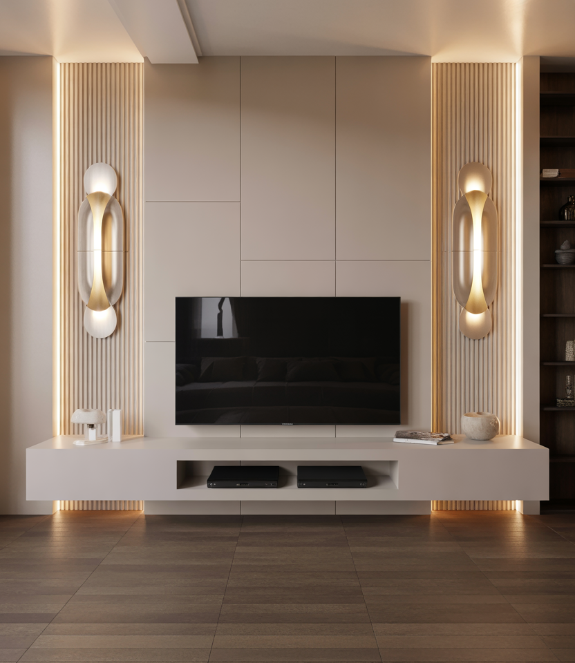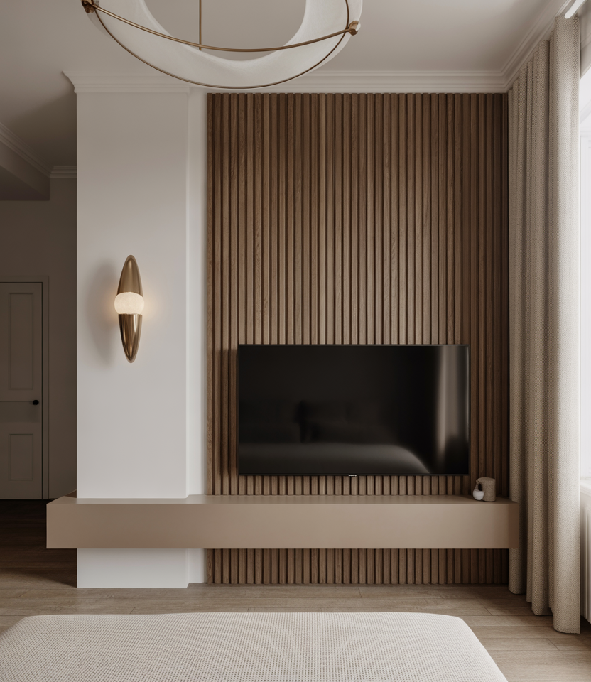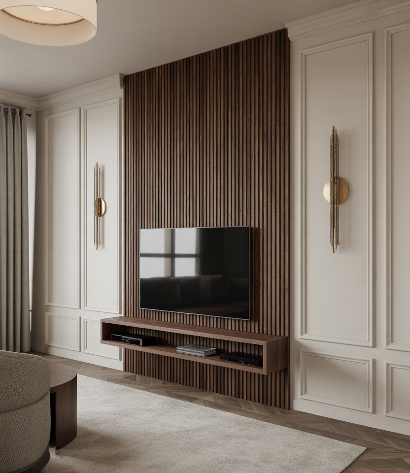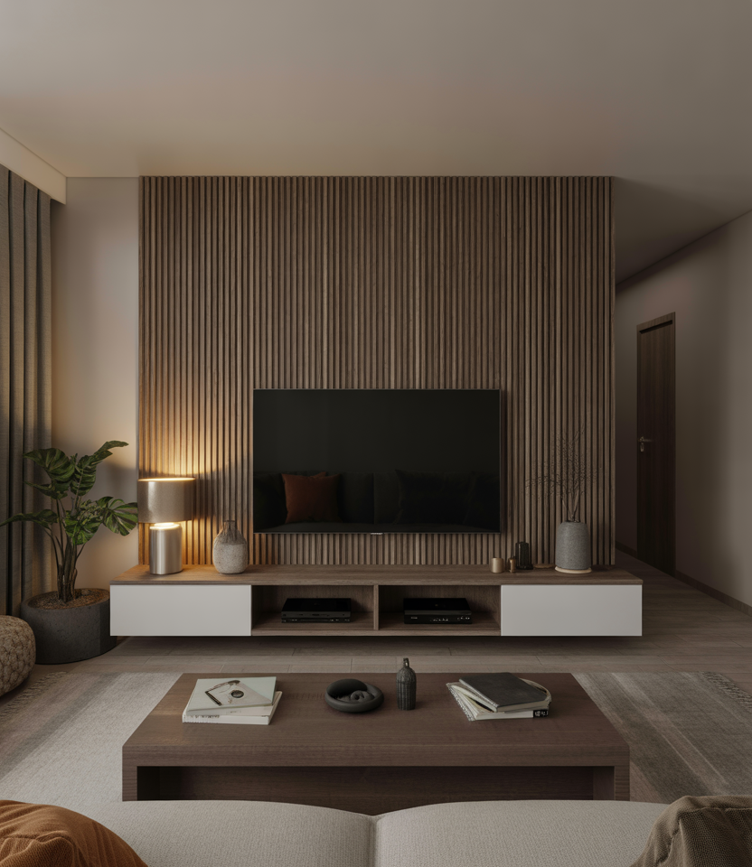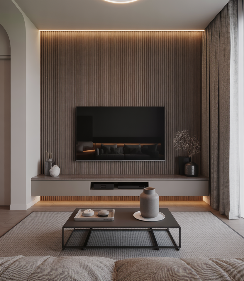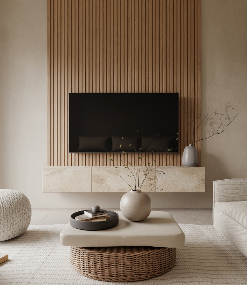 For instantly modern warmth, a vertical wood panel field behind the TV adds rhythm without bulk. I used this in an apartment where sound felt harsh; the slats softened the echo and looked like modern luxury with thin modern TV units below. It scales to large rooms yet stays simple enough for a starter place. Keep decor edited—one vase, a plant—and your weeknight shows will feel calmer, more curated, and more design than device. Works beautifully through 2026.