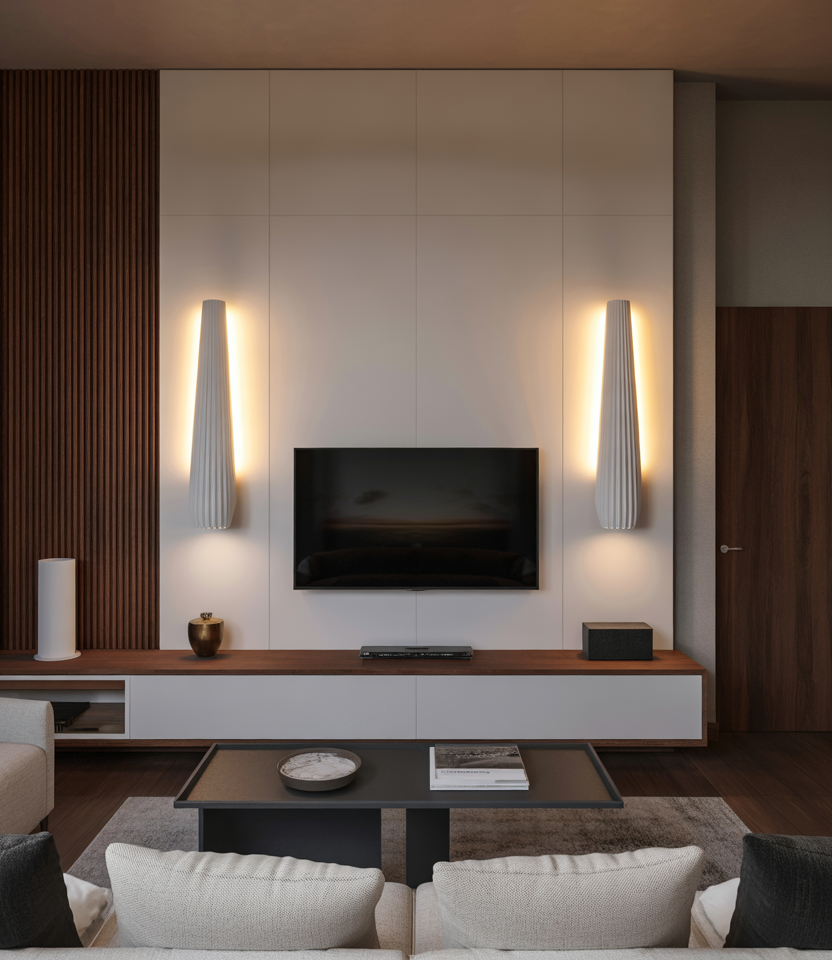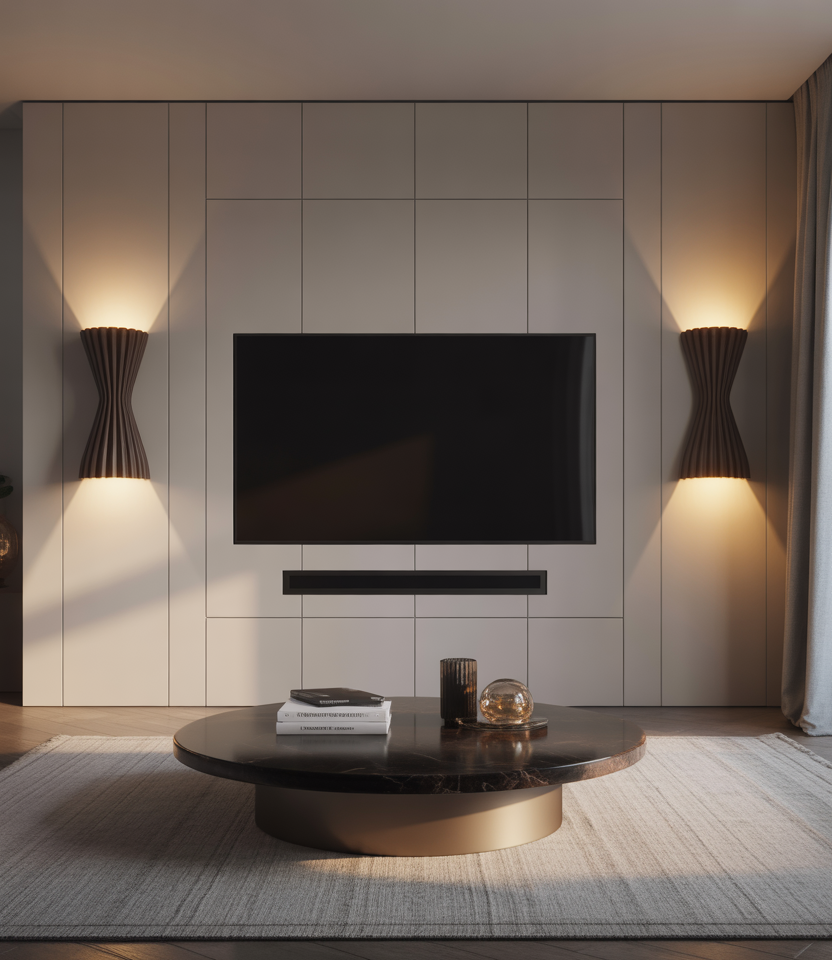 Flank the TV with sculptural sconces to formalize the composition—instant modern luxury design. Put them on dimmers for game day versus movie night. I’ve used bold forms in otherwise quiet modern interiors, and the wall suddenly felt “finished.” Skip extra art; the light becomes jewelry. Works in apartment living rooms and new builds alike in 2026.