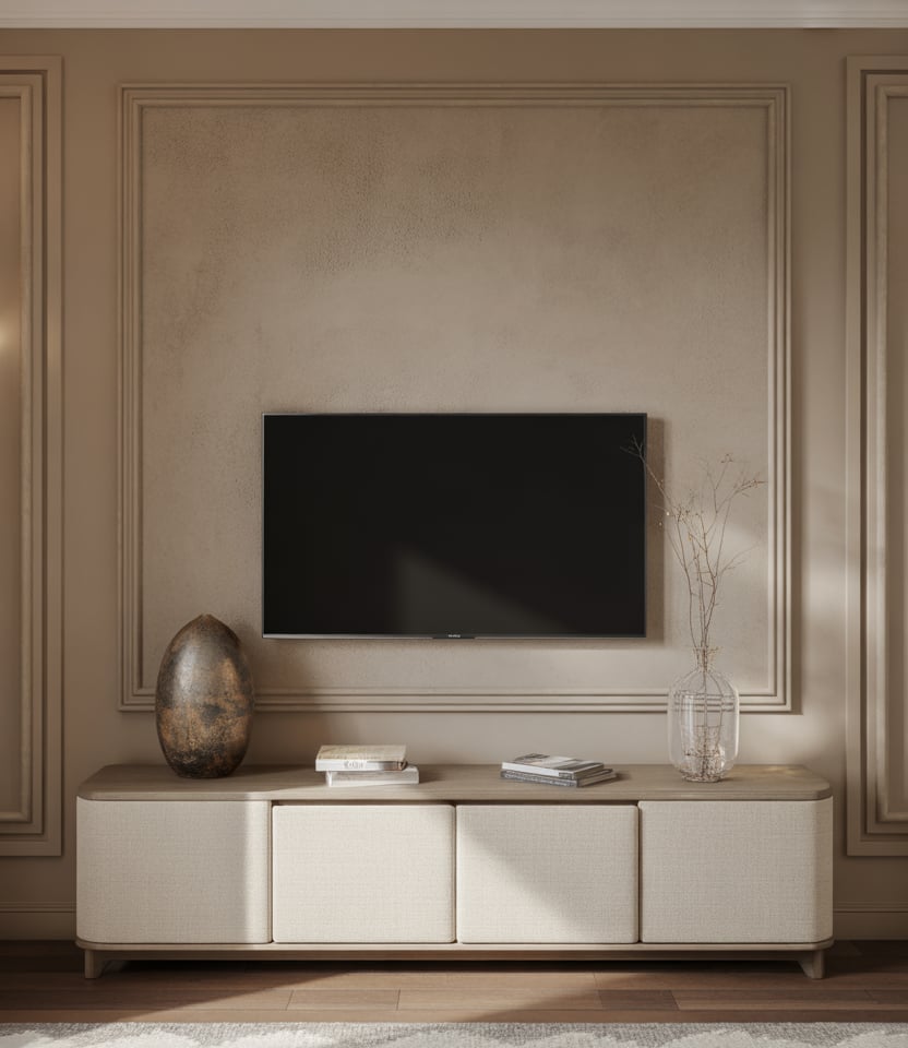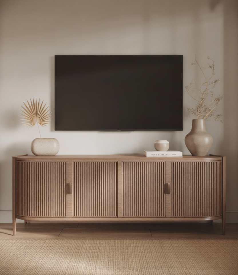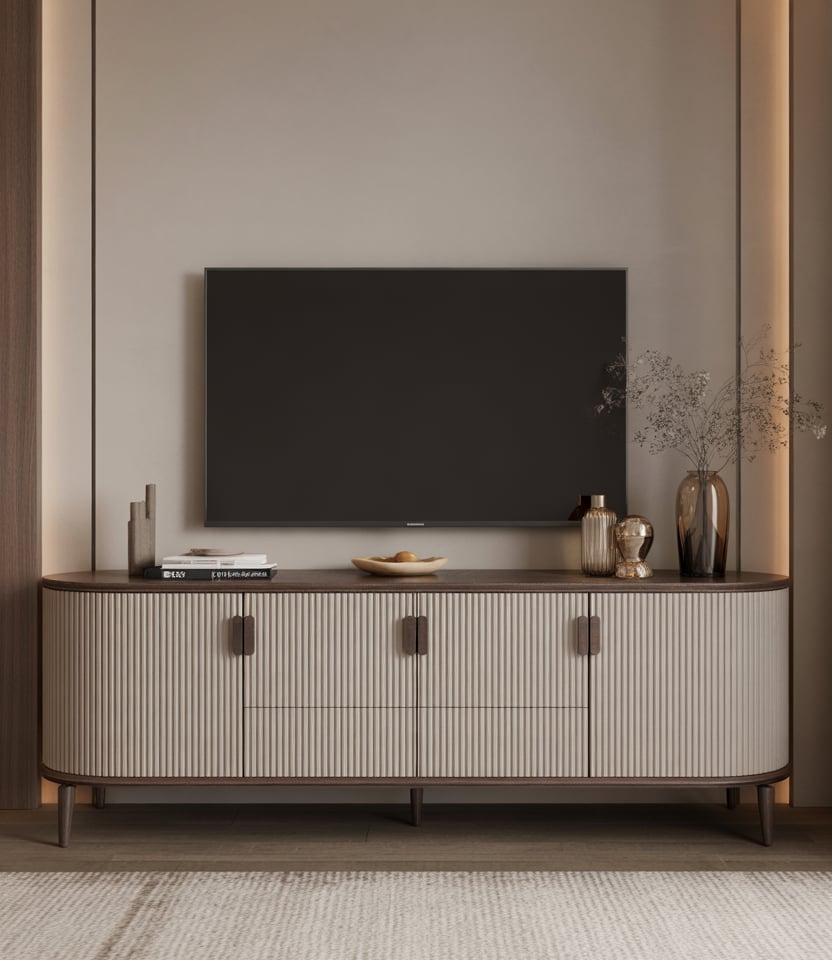 Ribbed fronts under a slim top add texture that photographs beautifully—why editors love them. Add thin bronze pulls, and you’ve got luxury interior design on sensible budgets. It fits modern, simple luxury rooms and friendly apartment layouts. Keep decor linear and let the ribbing sing; the TV reads like a quiet black window above.