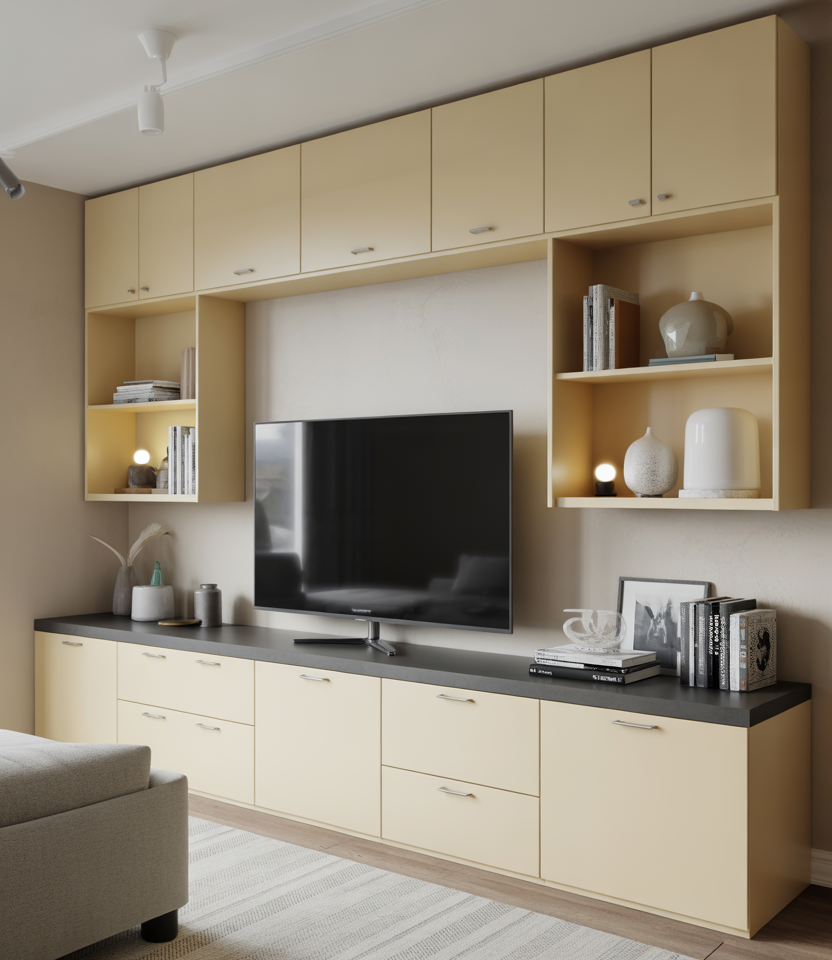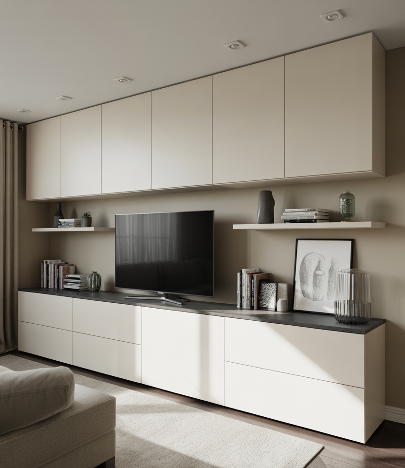 Nothing beats a clever Besta Ikea run: long, low storage that looks built-in when repeated. I’ve capped ends with open shelves and added a slab top—clean, modular Ikea at its best for modern TV units. Great for small apartment interior design and first homes in 2026. Keep one finish for a custom vibe and tuck lighting inside for a boutique glow.