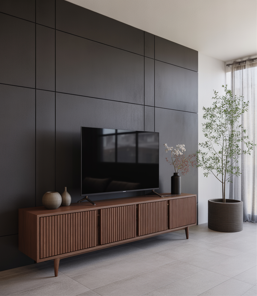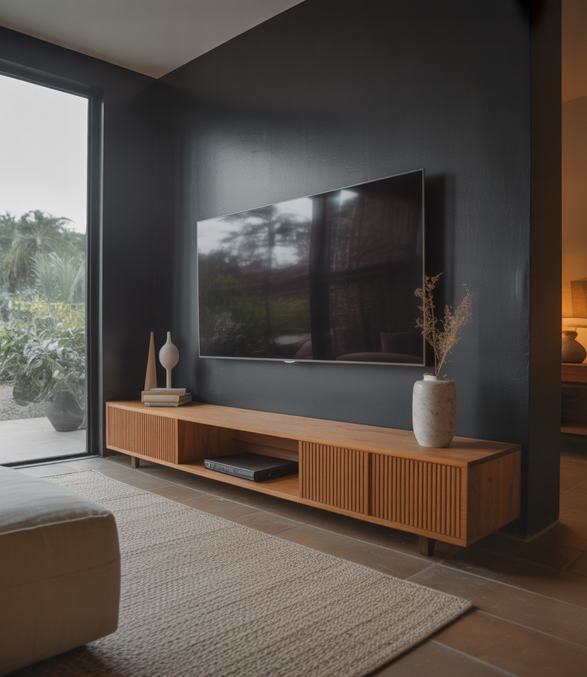 Paint the TV wall matte black, and the screen nearly disappears. I paired it with a warm wood console—a contrast that feels modern and quietly luxurious. Frames and ceramics pop, while the tech recedes. Keep decor big and few; ten tiny objects read busy. This is a modern idea that will still feel grown-up in 2026, not a gimmick.