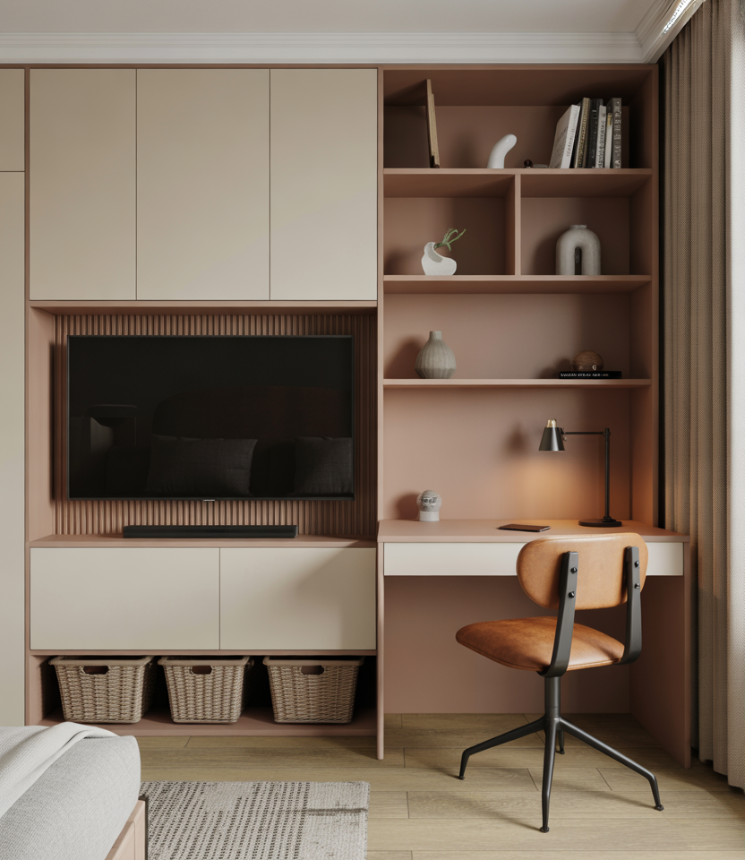 Real life needs work zones. Add a pocket workstation with a desk inside the TV wall; grommets and lids hide cords. In an apartment, I tucked a laptop shelf behind a flip-down—homework at six, shows at eight. Match finishes to modern TV units so it feels intentional. It’s designed for everyday chaos and will still read polished in 2026.