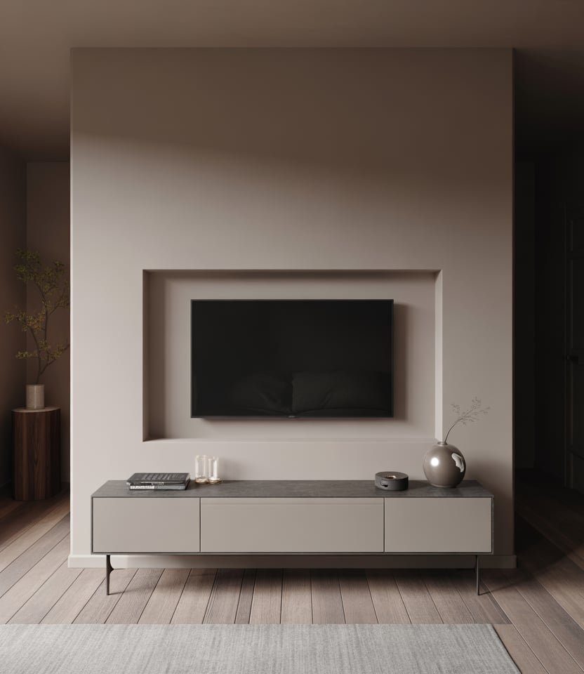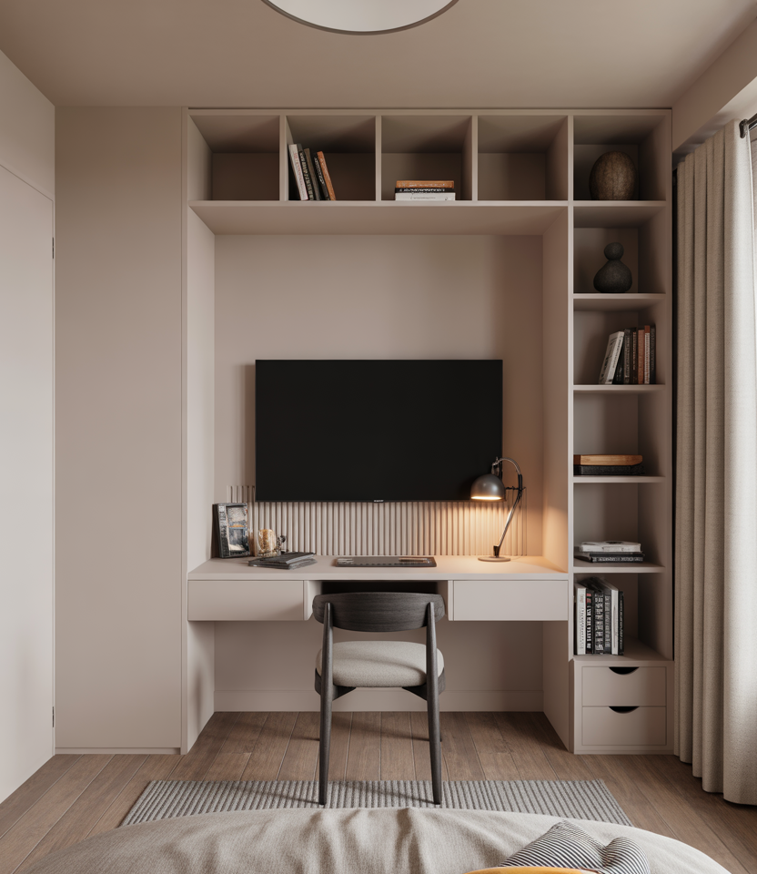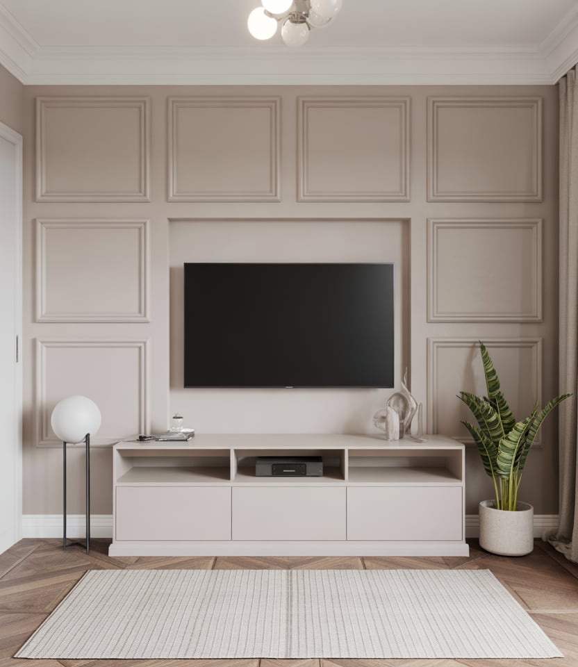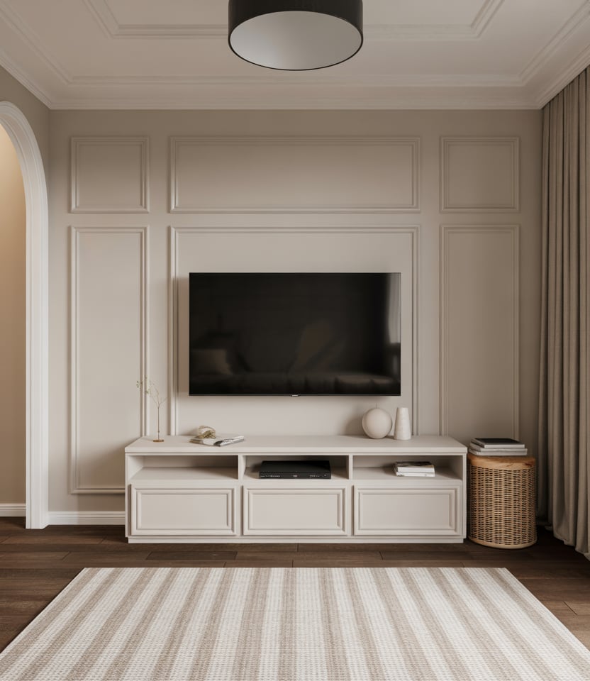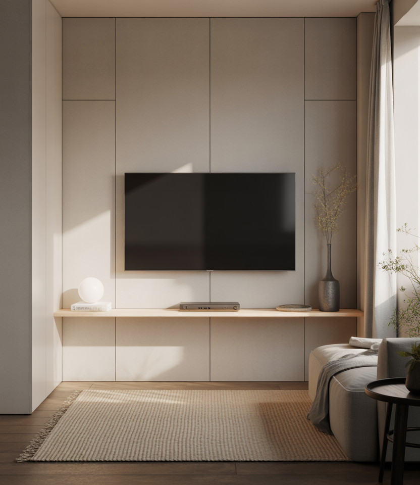 One ultra-thin shelf under the TV—nothing more. In small apartment interior design, visual noise is the real enemy; this keeps sightlines clean and life easier. Stream boxes hide behind perforated doors or go app-only. It’s the essence of simple modern comfort, still relevant for 2026 and beyond when you want the room to breathe.