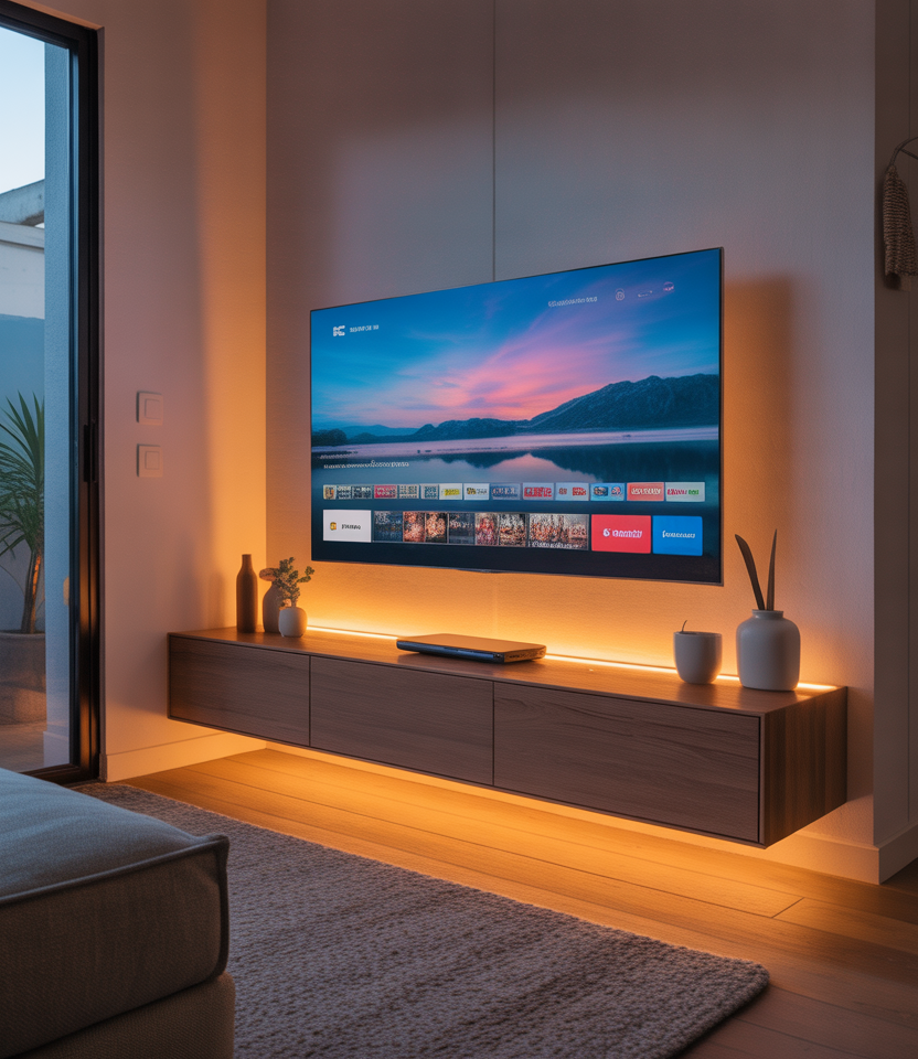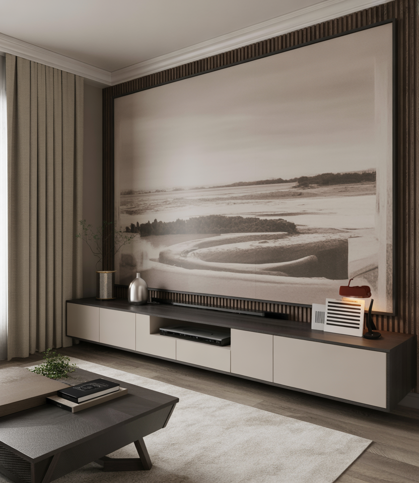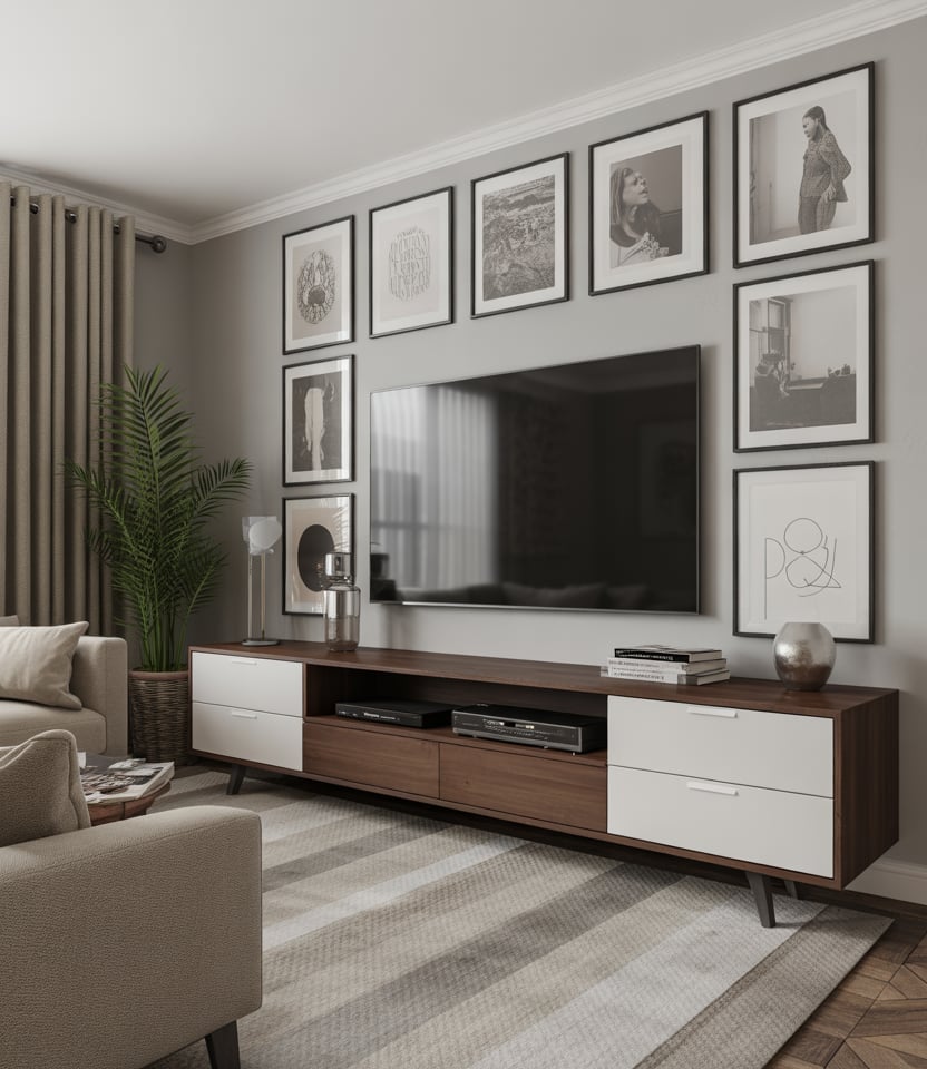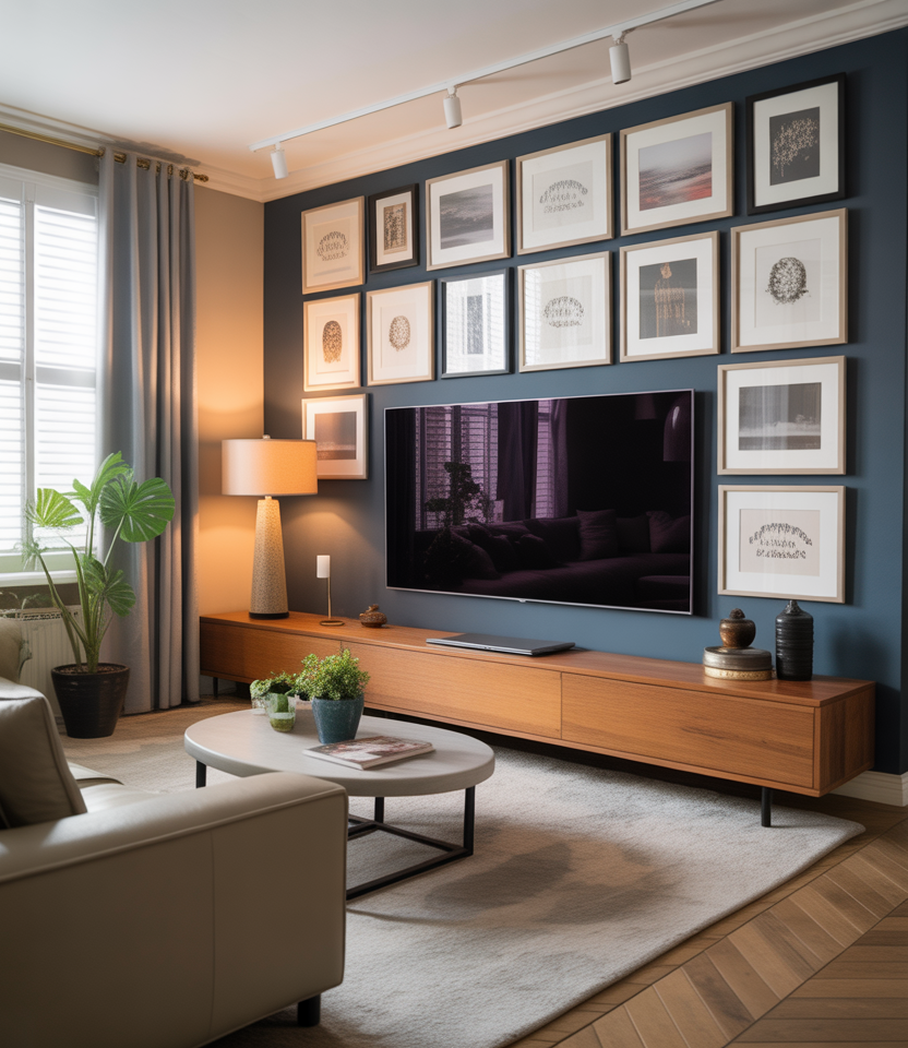 Treat the TV like one frame inside a curated gallery. Repeat two frame finishes and keep spacing consistent. I used this in a narrow living hall where the screen felt bossy; art restored balance. It reads design first, device second, and suits large rooms or apartment nooks. Fewer, bigger pieces beat a swarm—always true in 2026.
