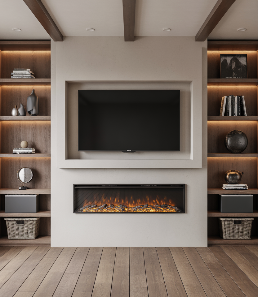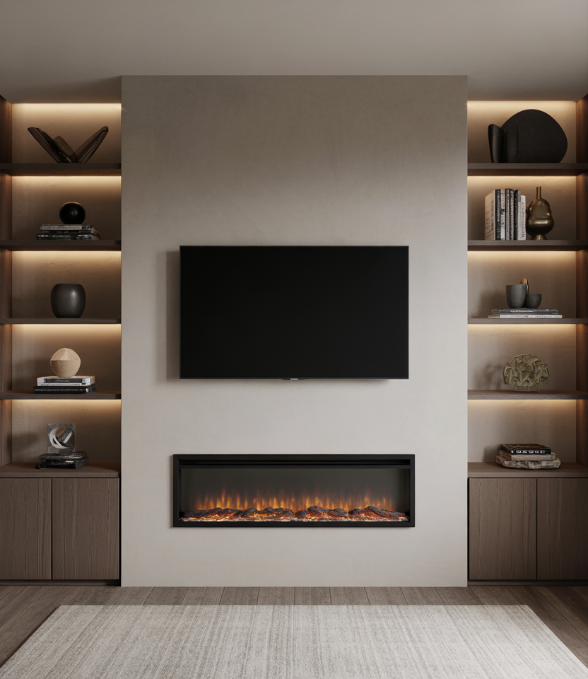 A TV wall with a fireplace marries glow and tech—pure modern luxury when aligned cleanly. I’ve installed an electric fireplace below a recessed screen; movie nights felt cinematic, and daytime news was less harsh. In open plans, stone or plaster grounds the look, while slim shelving keeps decor light. It’s comfort first, design second, and still a hero in 2026 for families who want the room to gather, not just scroll.