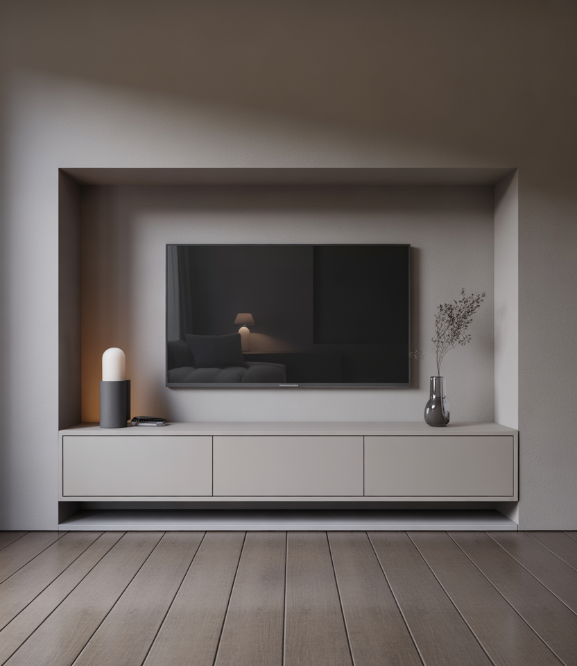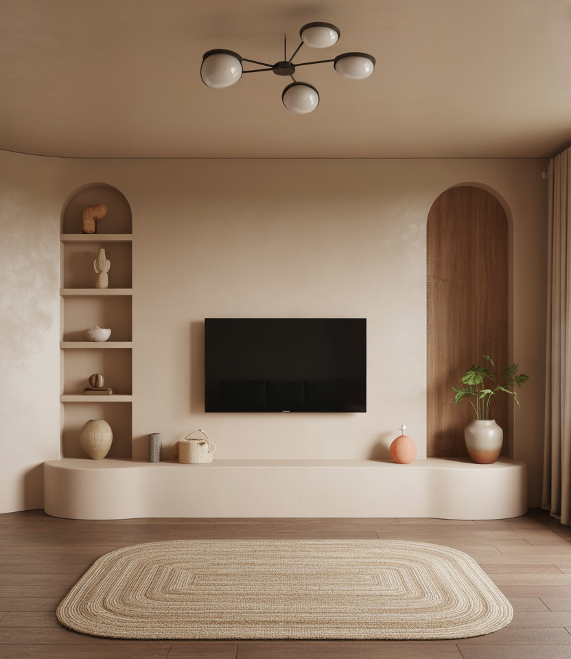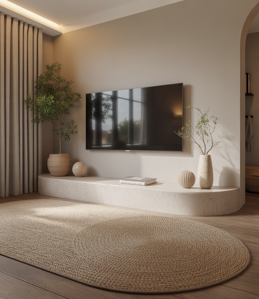 Curves soften tech. A gentle radius plinth under the TV feels friendly in family spaces and quietly luxe in micro-cement. Works for mounting TV media consoles or freestanding benches, dovetailing with design ideas that repeat forms. I mirrored the curve in a rug, and the room relaxed—very 2026, very livable, with no sharp edges emotionally or literally.