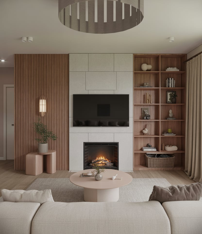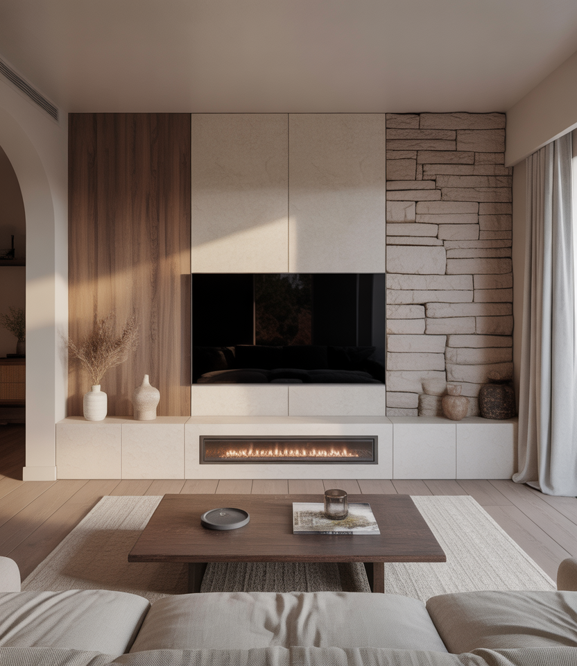 Blend timber, fabric, and stone—but tone them to a single palette so the wall reads as one idea. It’s a stylist’s shortcut to custom design that slots into luxury interior design or a modest apartment equally. Works with or without a fireplace, above modern TV units or floating shelves. Unity first, details second—that’s the 2026 mantra.
