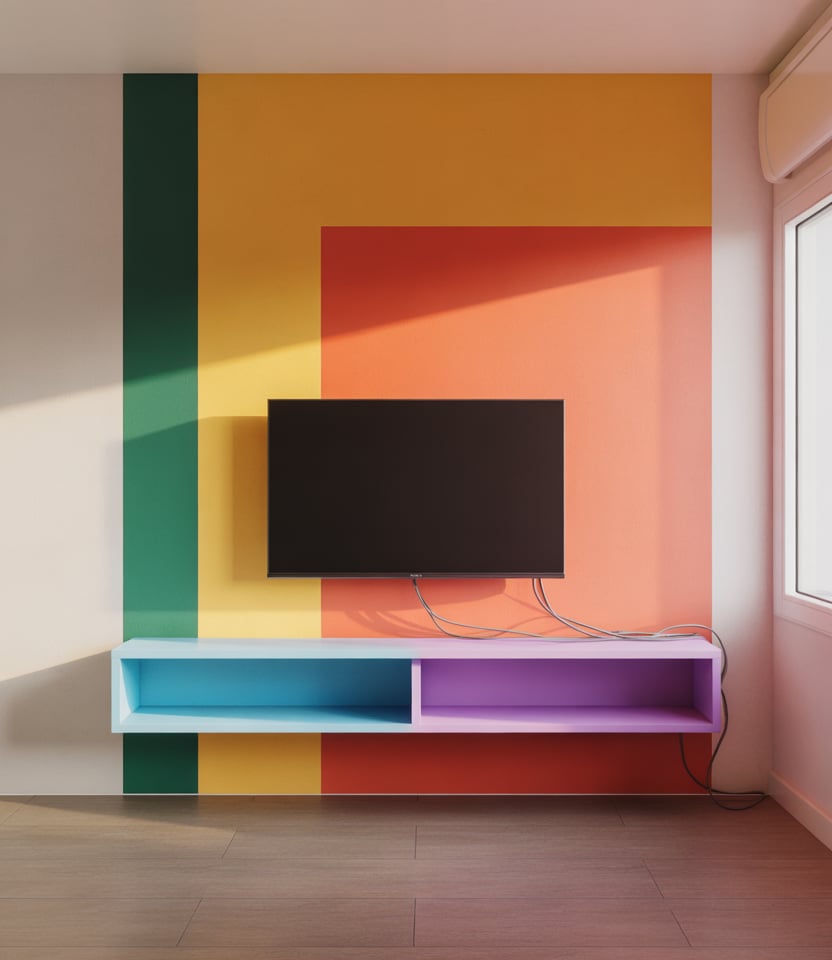 On a budget? Use my favorite DIY trick from modern; it’s still looking sharp in 2026. Frame the TV with a bold rectangle. Use a color two shades deeper than the walls for an intentional look, and small apartments and tight spaces will appreciate the difference. Pair with a wafer-thin soundbar shelf and keep the decor quiet. It’s simple, graphic, and modern—totally.