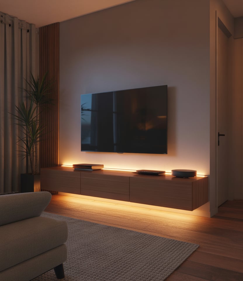 A wall-hung console lifts the floor plane—perfect for small space living—and a hidden LED adds hotel-level glow. This is Mount TV media consoles done right: no hardware, no fuss, just design that feels like modern simple luxury. I set one at 9 inches high in a rental; cleaning days got easier, and the room felt bigger. Keep it simple and you’ll never miss the legs.
