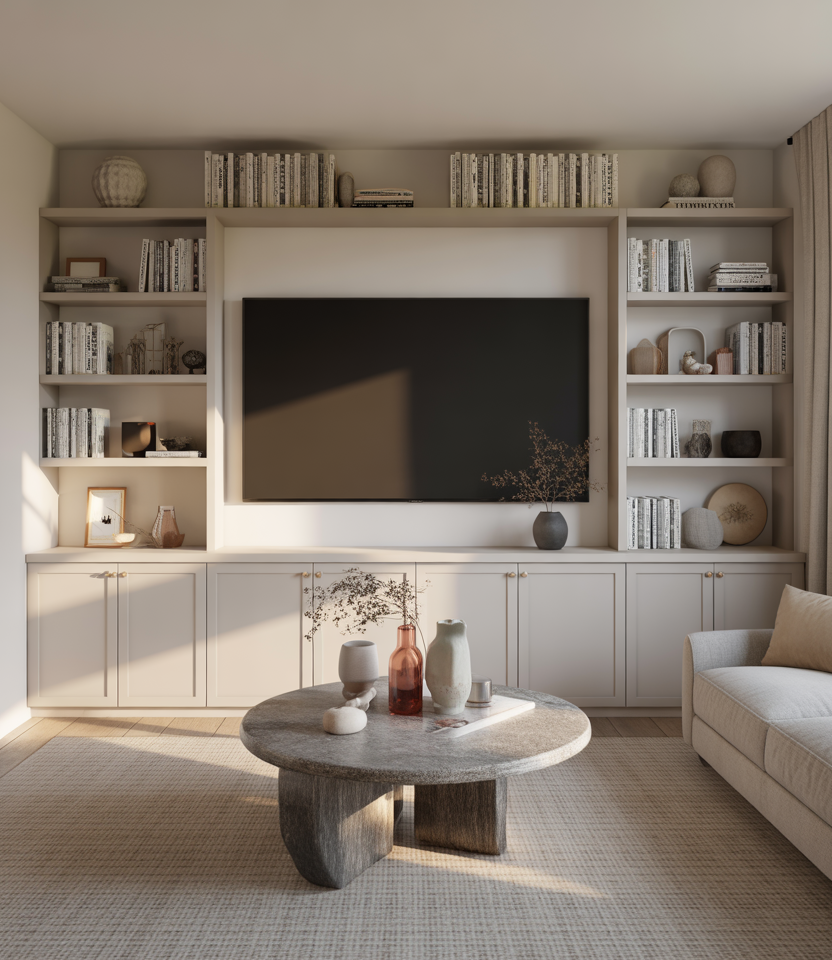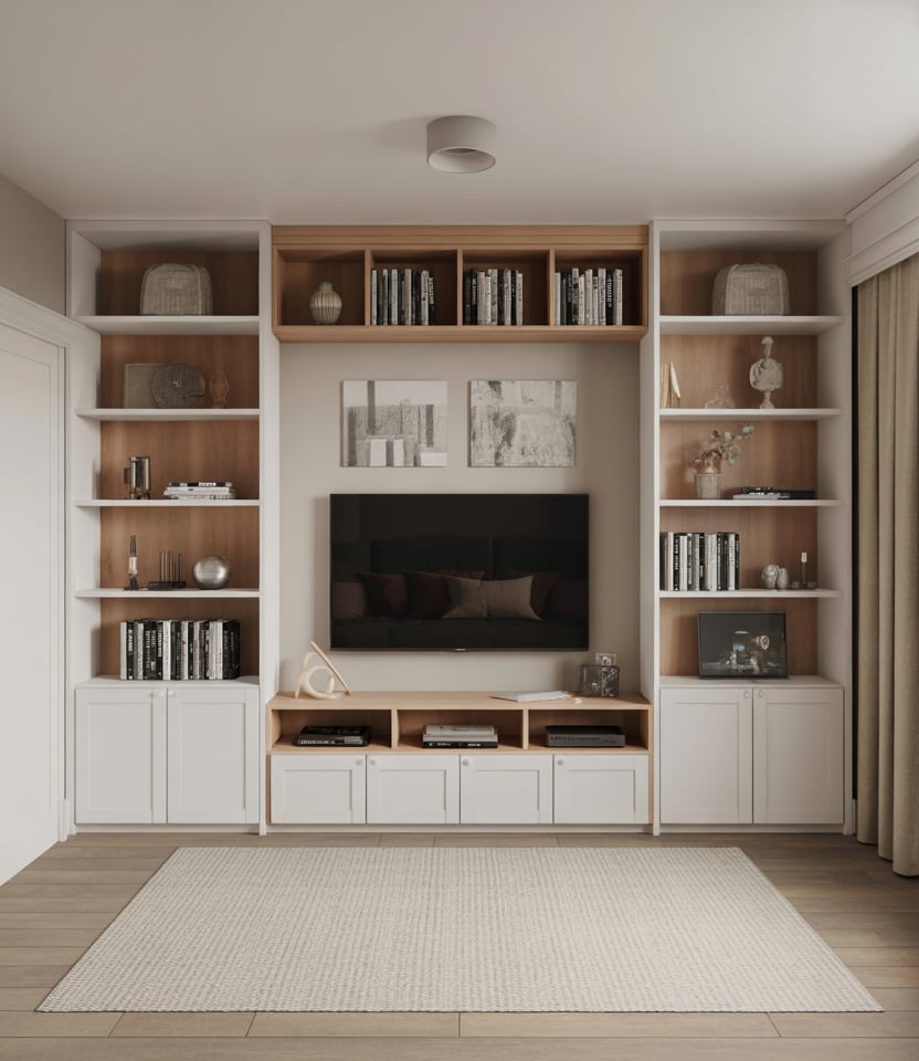 Center the TV and flank it with bookcases—simple, classic, satisfying. Closed bases hide gadgets; uppers display edited decor. This works for families in an apartment or for luxury interior design libraries in large homes. The trick I use: style shelves in thirds, leaving negative space so the composition breathes. It reads like bespoke design at everyday budgets.