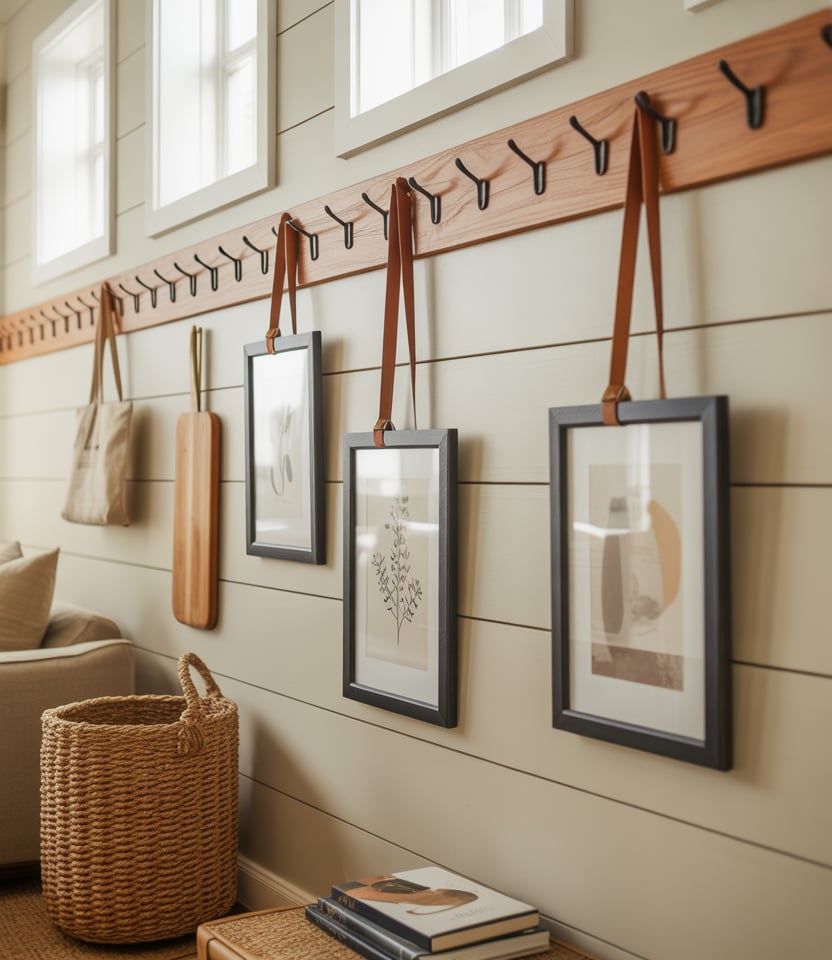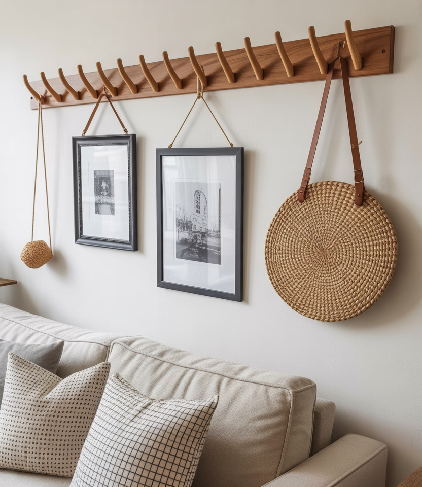 A Shaker-style rail adds function and soul—hello, modern farmhouse fans. Hang a frame, a basket, or even seasonal hats; fewer, larger items keep designs calm. Mounted high over the couch, it gives vertical interest without crowding seating. Mix wood pegs with black frames for balanced ideas and modern-looking seating. It’s an easy weekend DIY and wonderfully adaptable for families—durable, organized, and friendly to ideas for 2026 living.