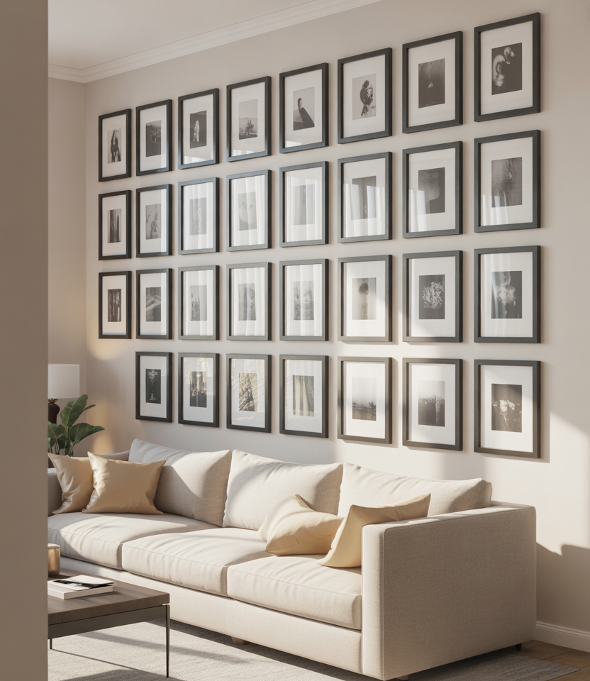A tight grid feels gallery-clean and expands a short wall upward—great for picture ideas when you print phone shots annually. Use identical frames and even spacing for crisp designs; maple warms, and black sharpens. Start the bottom row near eye level and let the rows rise to crown the couch. For apartment renters, Command-style hardware keeps patching minimal. Pair with a simple rug so the wall does the talking—orderly, modern, and right for ideas in 2026.