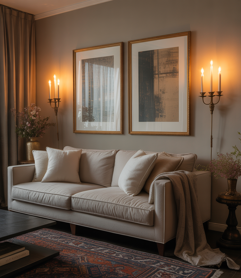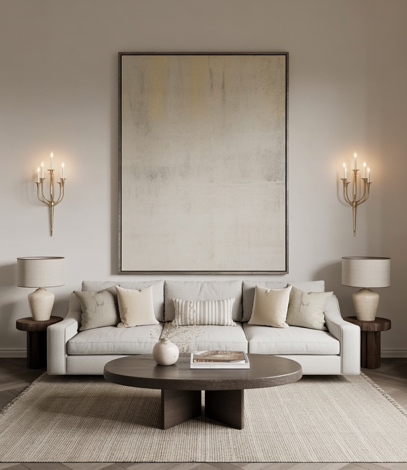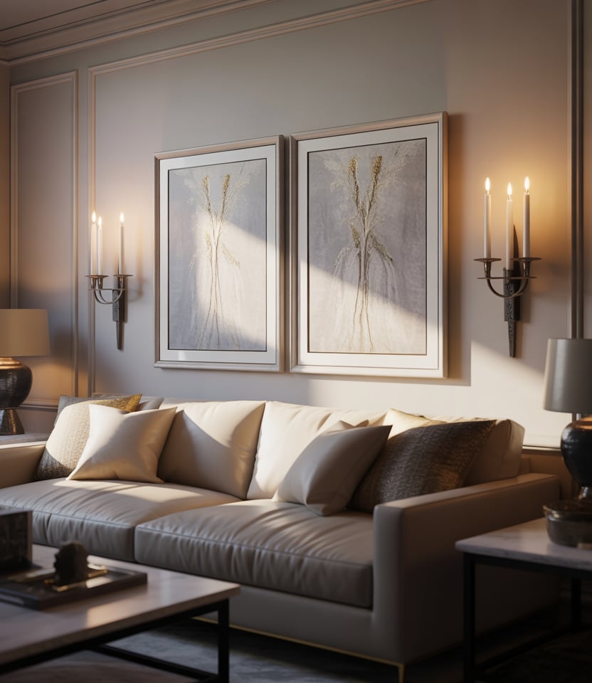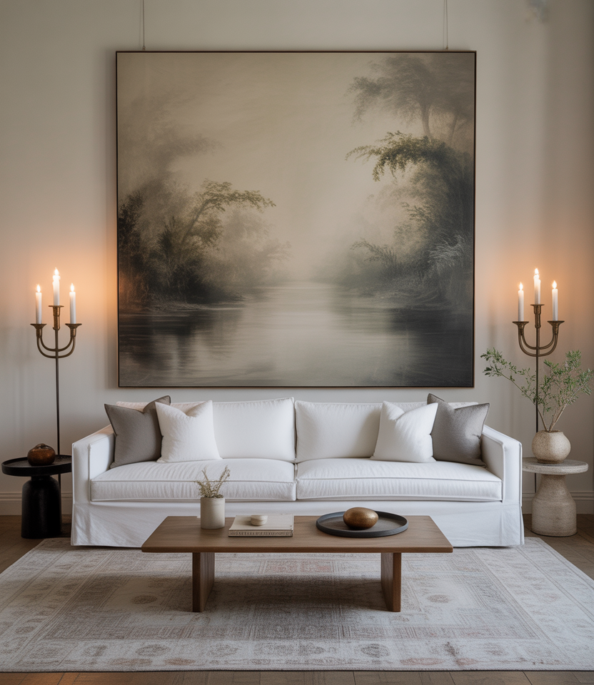 Two works, one calm geometry. A diptych’s balanced rhythm leaves space for light; flank with candle sconces for evening atmosphere. Keep gaps equal to frame width for tidy designs, and align centers with the couch back. If committing to a big piece feels scary, start here—scale is simple, mood is elevated. It’s approachable polish for ideas for 2026 homes, from first apartments to forever houses.