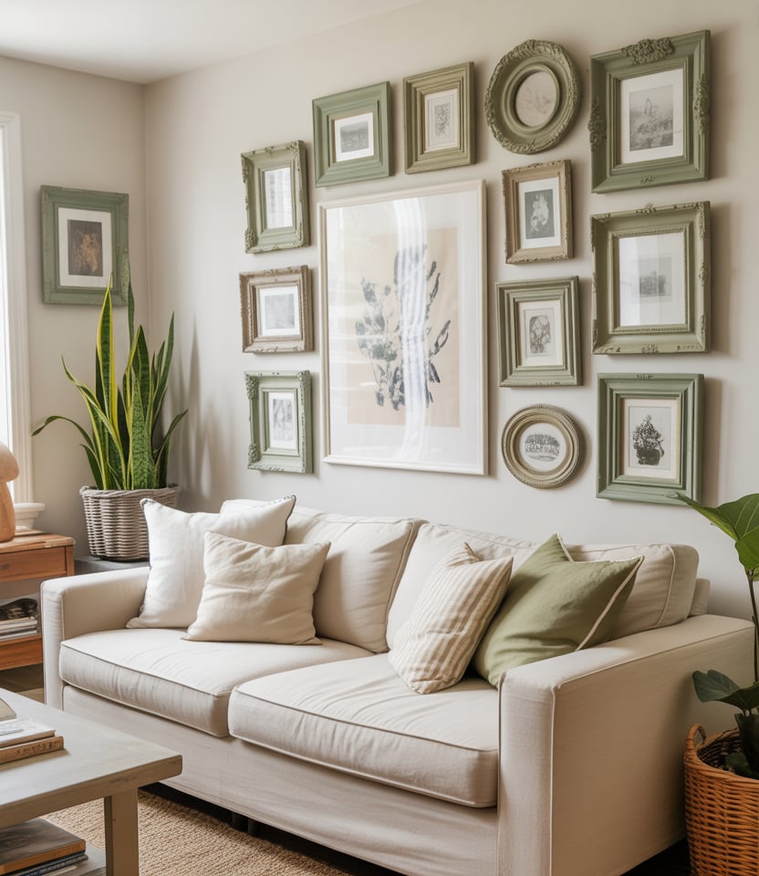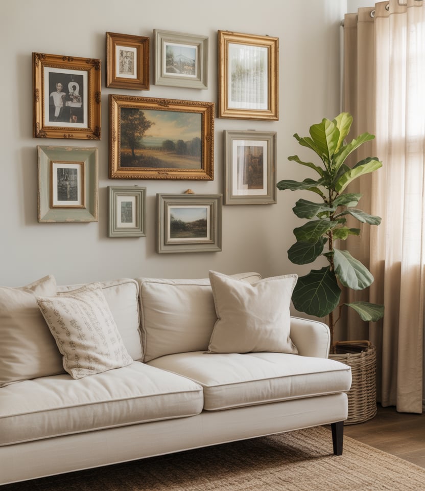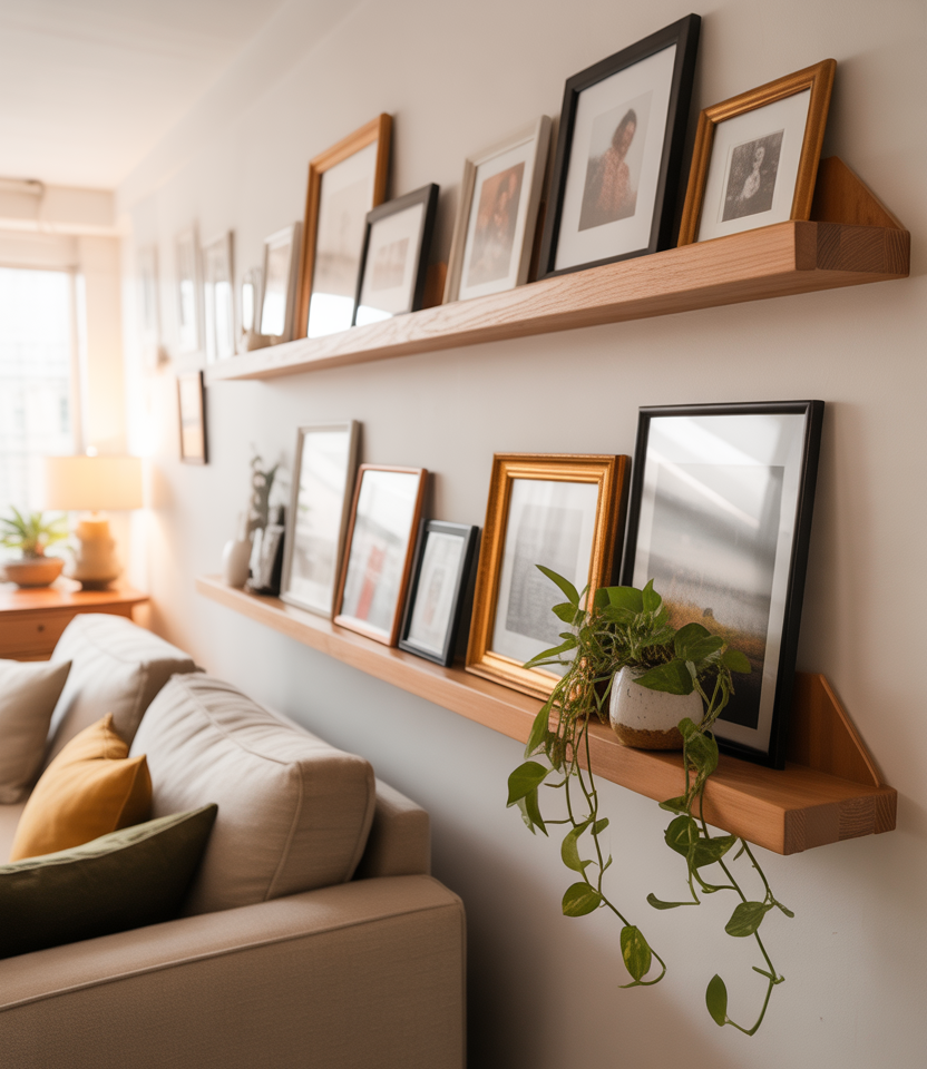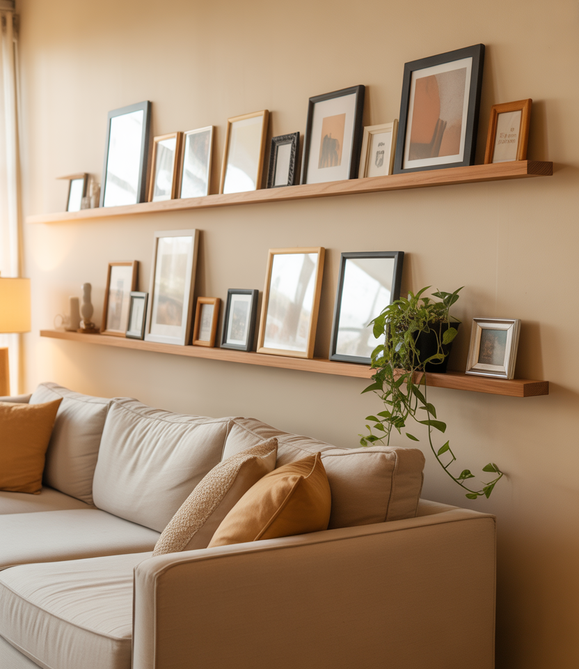 Instead of nails, use slim ledges, and let your wall evolve. I have implemented the idea of rotating travel prints and kids’ drawings—a low-stress idea that works decently for interchangeable pictures that change with the seasons. Two staggered ledges over the couch give the illusion of layering while maintaining a sense of lightness. For cohesive designs, keep the frame tones consistent and add a tiny plant for life. It provides storytelling without the need for renters to patch and paint, and it’s a friendly, do-it-yourself project. For 2026 ideas, it’s the flexible display that will stand out instead of a fixed display, and it will have a great effect on daily life in apartments.