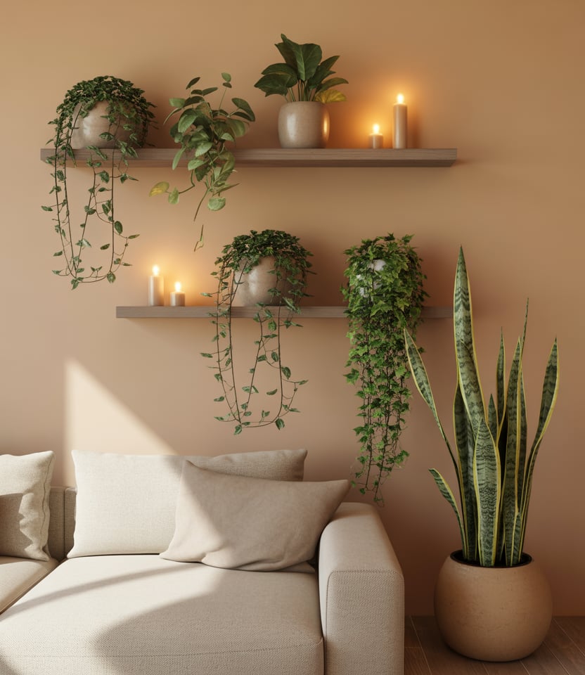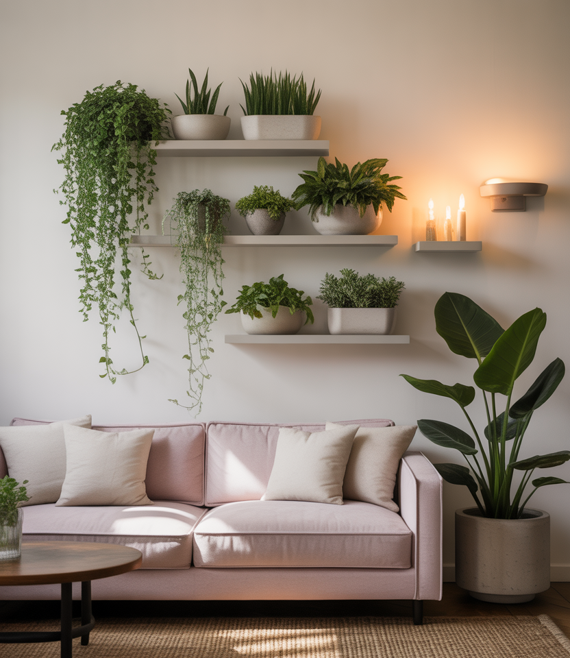Greenery softens tech and stress. Use sturdy ledges for trailing pothos or sculptural ficus; if upkeep scares you, dried branches give a similar silhouette. Match planters to couch fabric tones for cohesive designs, and add a discrete grow light near candle sconces. Biophilic designs of the future will include walls that offer unencumbered calm to a space. Nature is the perfect remedy for abundant activity in a room and cramped floor plans in apartments.
