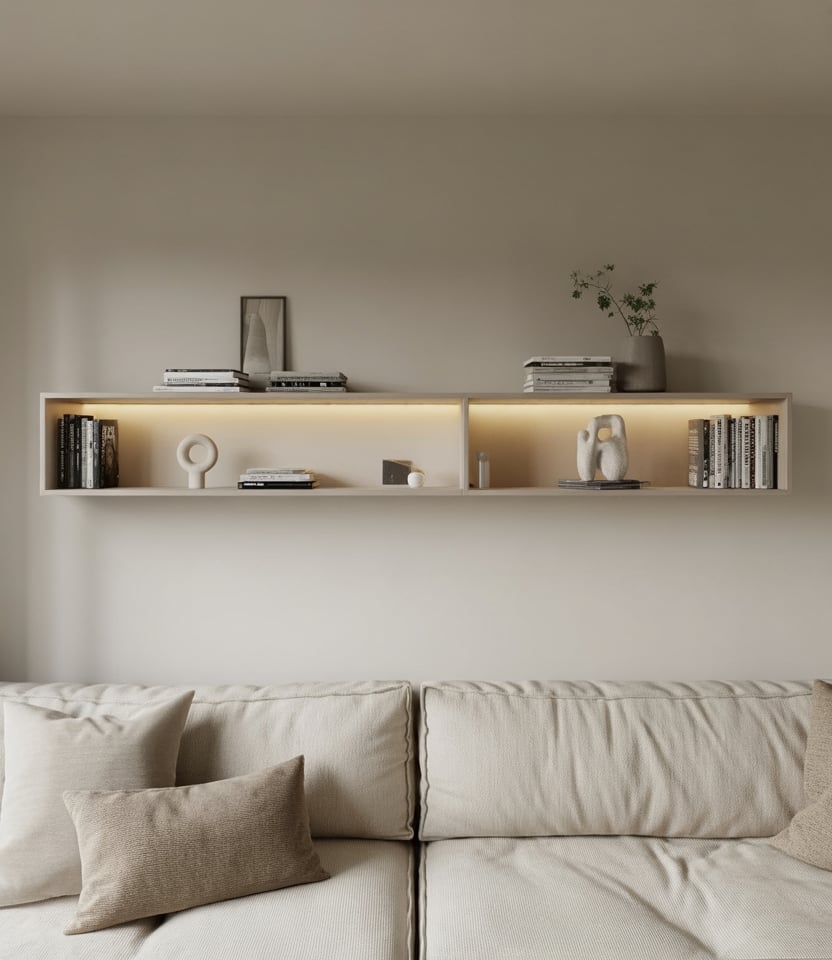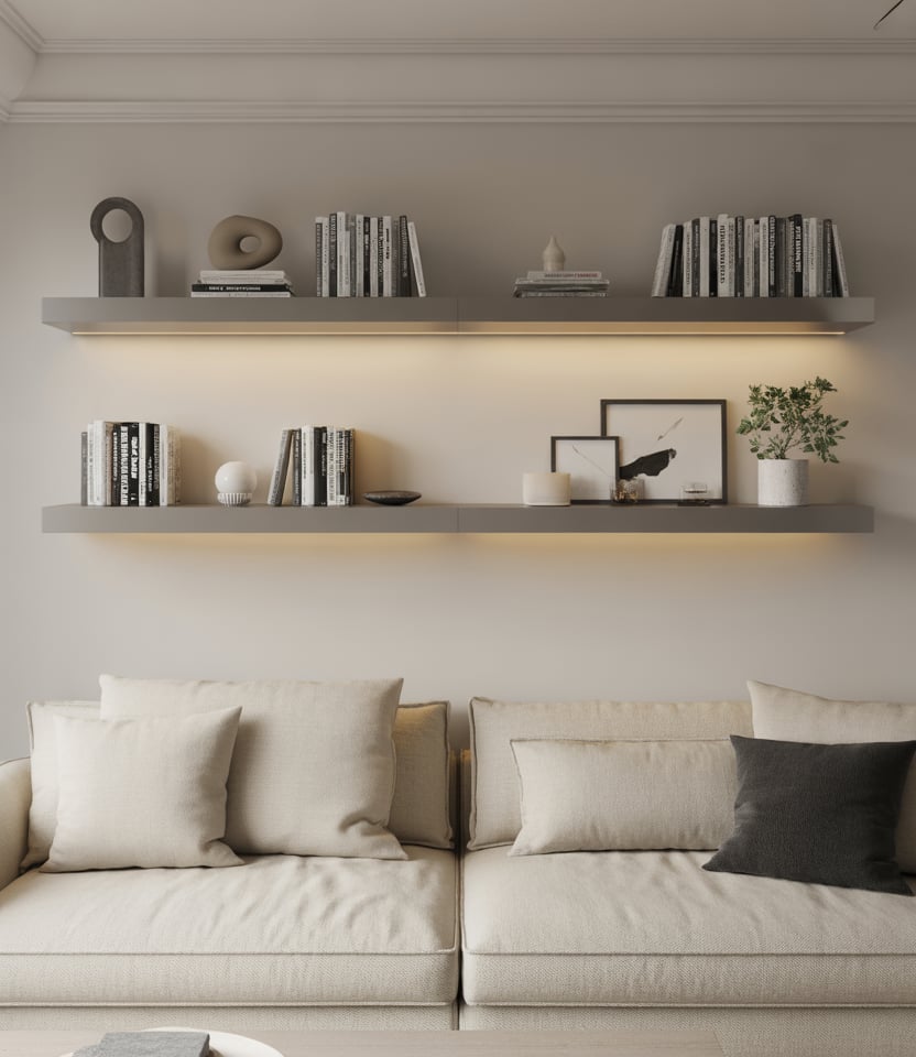 Floating shelves are a flexible DIY favorite, but restraint keeps them chic. Style in thirds—books, one sculptural object, and one plant—leaving negative space so designs feel intentional. Mount high over the couch to avoid head bumps and match the wood tone to the flooring for harmony. A small LED wash beneath adds evening drama that flatters ceramics and leaves. This modular approach adapts to modern or cozy cottage ideas and earns a long-term spot in ideas for 2026.