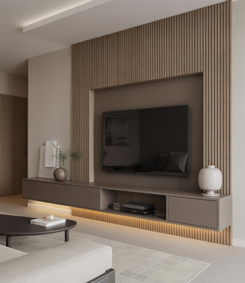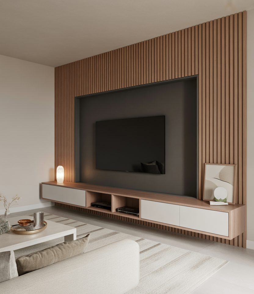 A shallow slatted-wood niche lends architecture to a blank drywall expanse and frames the screen—smart ideas with TV that look built-in. Match slat stain to flooring for harmony; paint the recess darker to hide glare. Keep side decor quiet so rhythm leads. The texture improves acoustics and warms modern rooms. This controlled focal point suits open plans and feels future-proof for ideas in 2026—subtle, functional designs that tidy the tech.