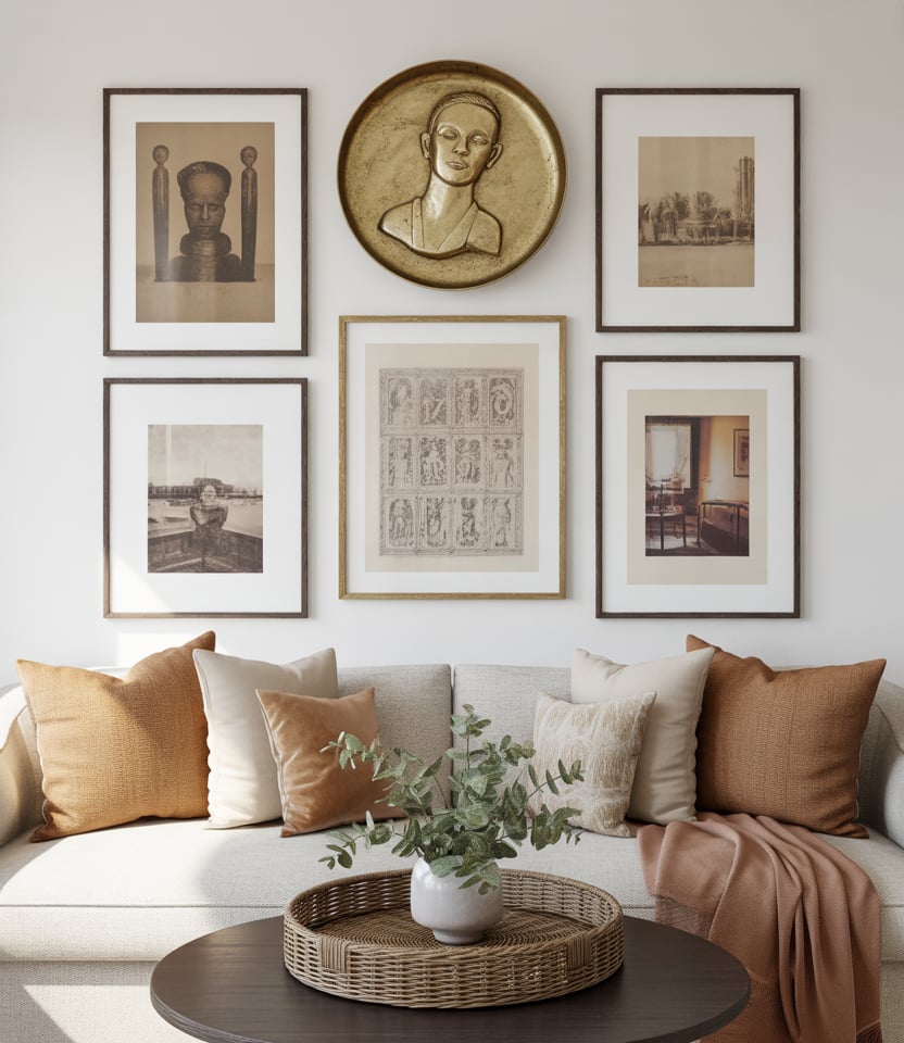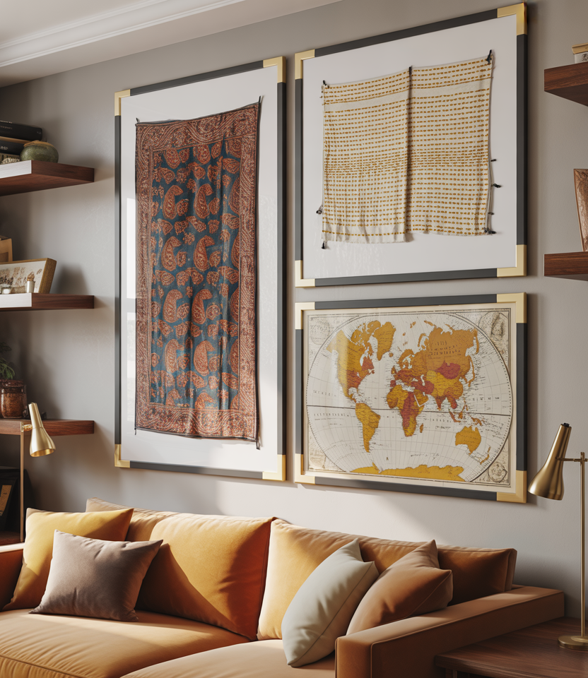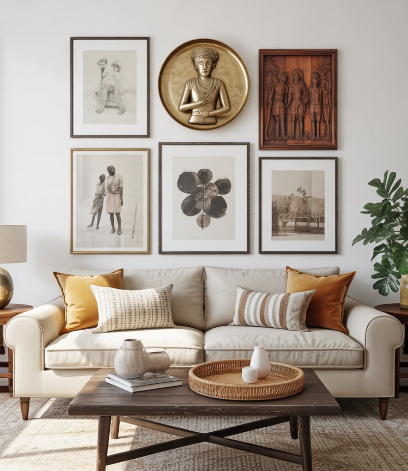 Blend framed art with a carved panel, brass relief, or cane tray for dimension. These tactile layers nod to craft and global ideas with Indian influences while keeping designs cohesive through a shared palette. Arrange them around a central anchor over the couch so the mix feels intentional. It’s an easy DIY hunt: flea markets, fair-trade shops, and your attic treasures. The result reads soulful and personal—exactly the spirit of Ideas 2026.