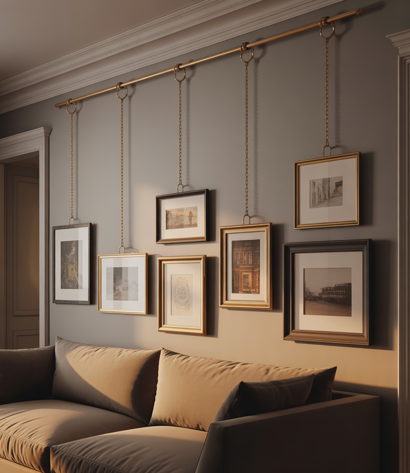 A discrete rail near the ceiling lets art hang on chains or cords—historic detail meets fresh designs. It’s perfect for plaster walls and indecisive curators; rearrange without patching. Over a couch, tall lines lift the room visually. Brass chain skews classic; cotton cord skews ideas modern. This renter-friendly strategy wins in ideas for 2026 for sustainability and flexibility—less drilling, more living.
