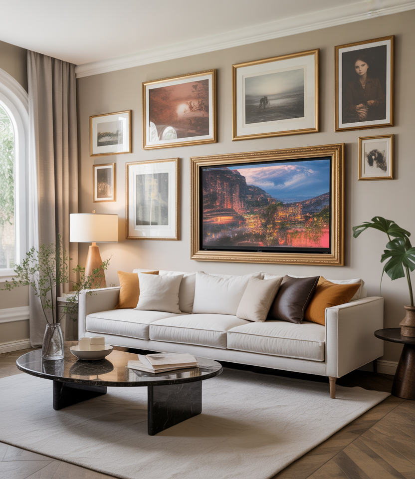 Use a frame-style screen and surround it with real art to create a blend, a smart use of TV that respects the room. Conceal the cords, choose a bezel that matches with nearby frames, and dim the lighting to control reflections. Hang the screen slightly lower than traditional art for comfortable viewing from the couch. This is pragmatic polish for Ideas 2026—technology playing nicely with design.