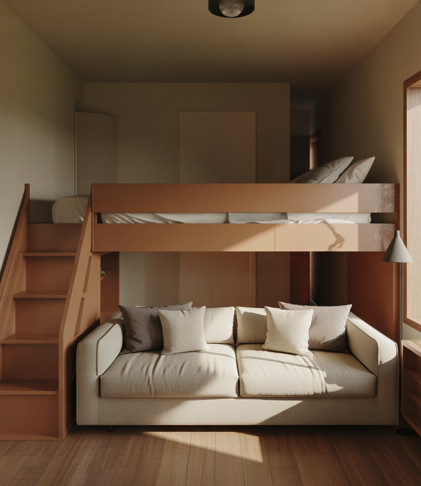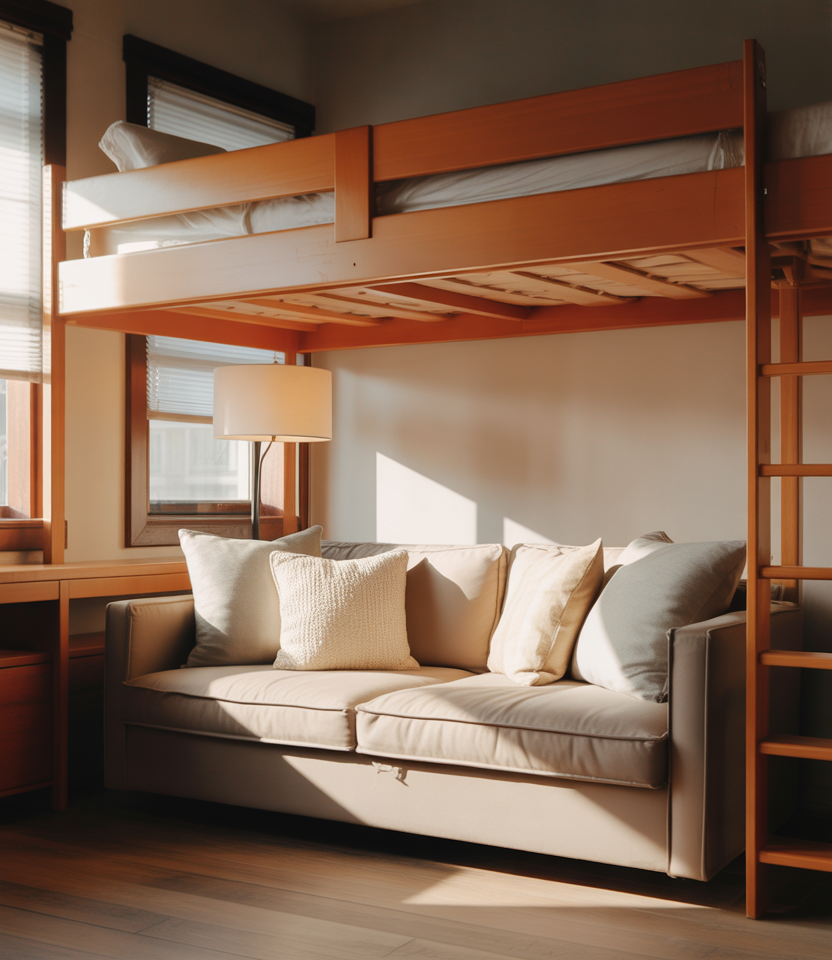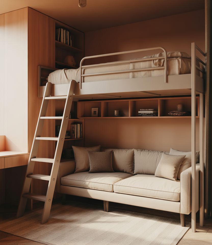 Adults are fully embracing loft beds, especially in small rooms and adult apartments where space must multitask. This idea pairs a streamlined loft with a sofa or reading nook below, making a single room feel layered and intentional. It’s practical without sacrificing comfort.