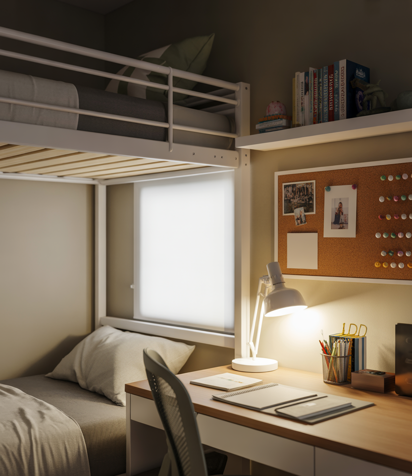 For teens, loft beds with desks are becoming the norm. These designs support school routines and leave space for a personalized teen aesthetic with decoration and textile choices like lighting, wall art, and soft furnishings. The separation between study space and sleep space feels natural, not forced.