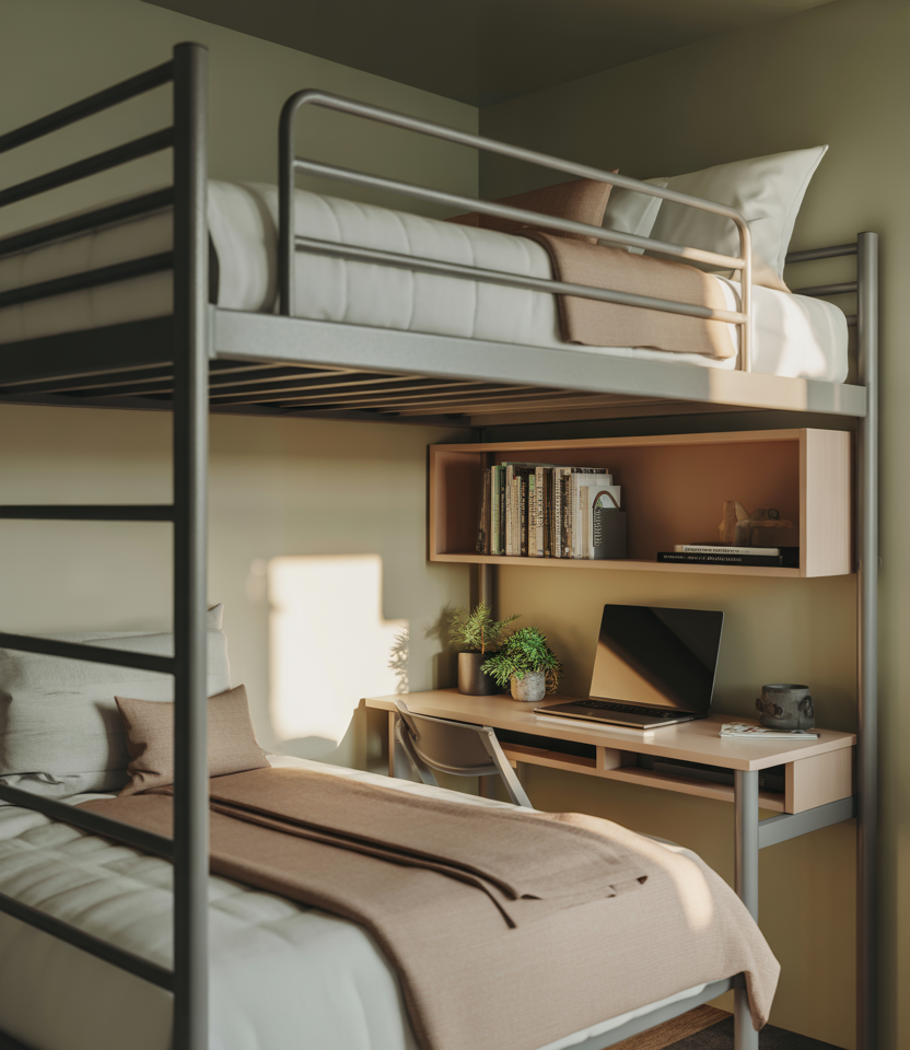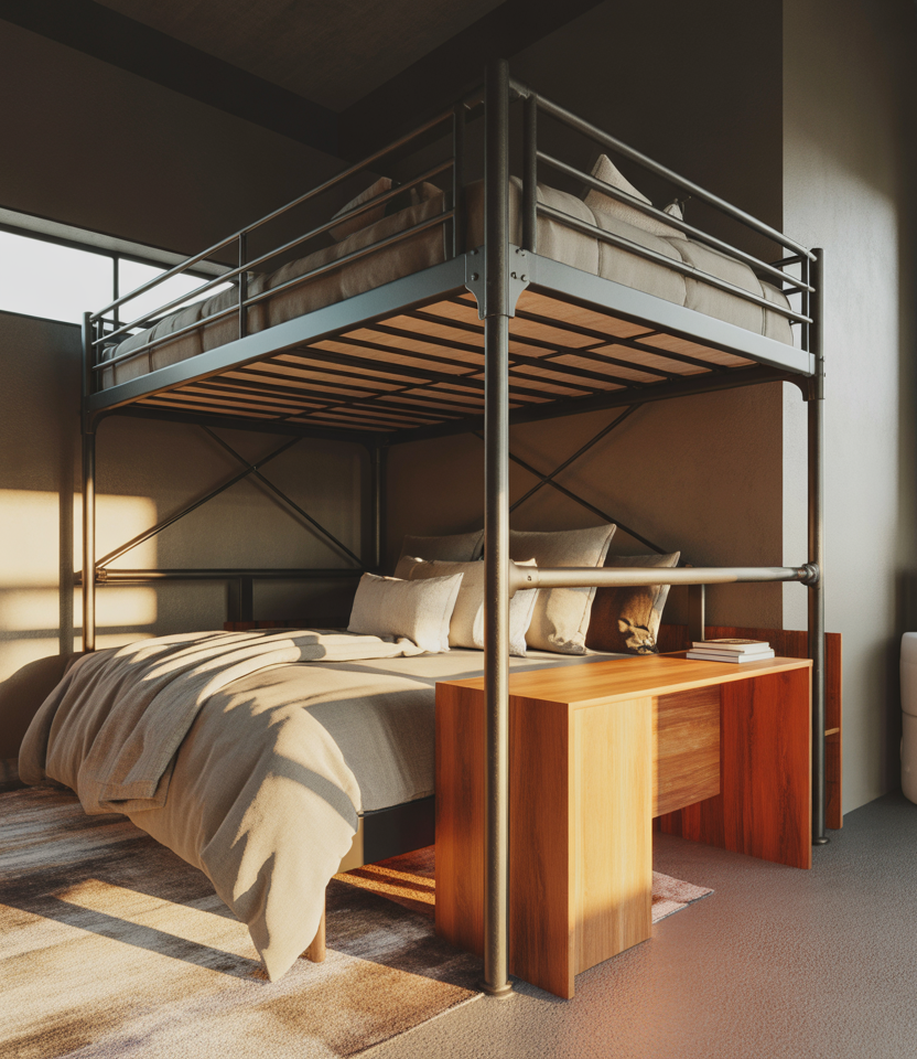 Industrial doesn’t have to feel harsh. Modern metal loft beds are softer in tone, often paired with warm textiles and neutral walls. They’re popular in converted apartments and small rooms in adult settings where durability meets understated style.
