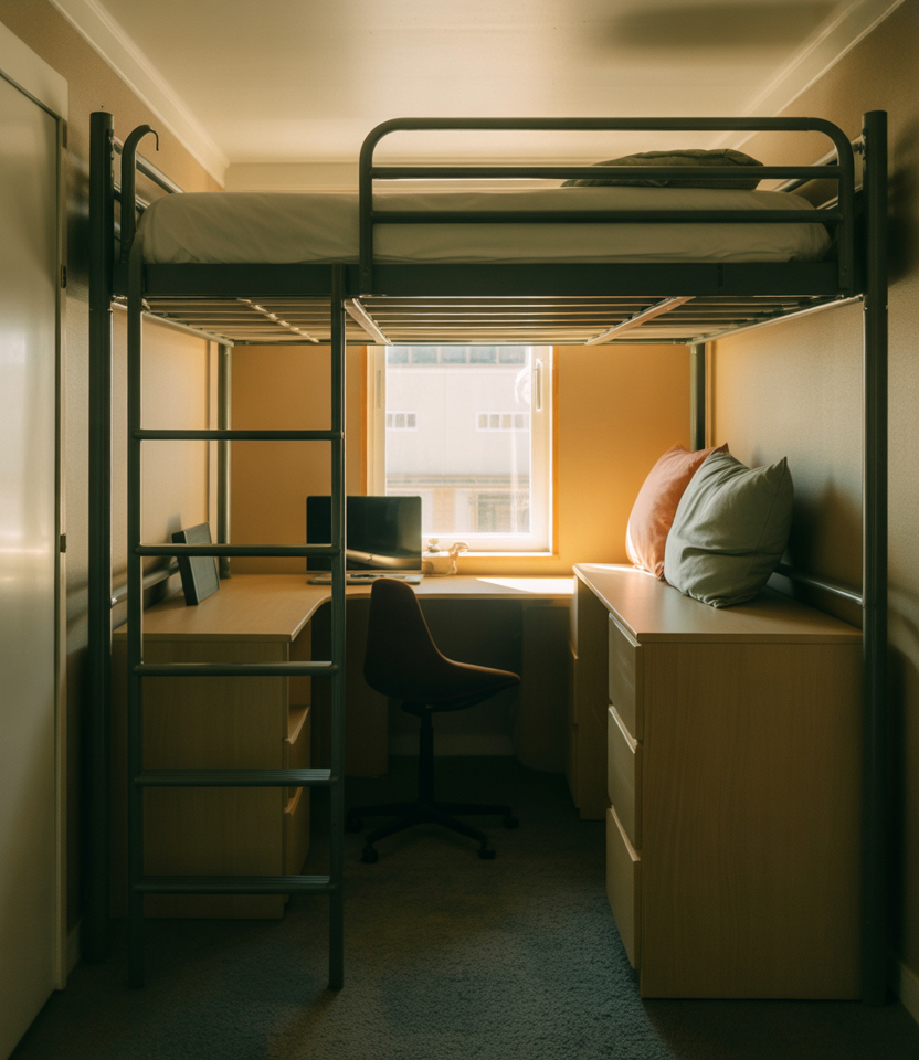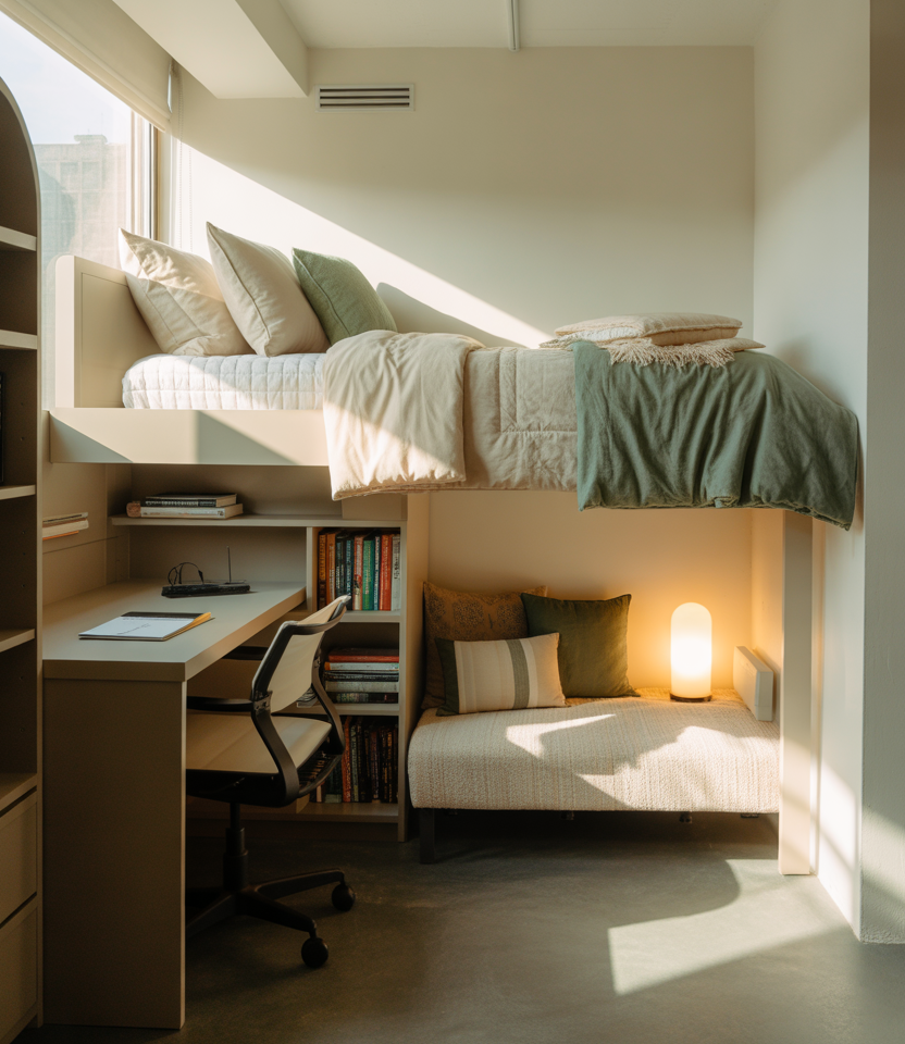 The twin loft remains an essential dorm, but the 2026 versions feel calmer and more personal. In a dorm, students are styling beneath the bed with rugs, lamps, and storage that make temporary spaces feel more like home.