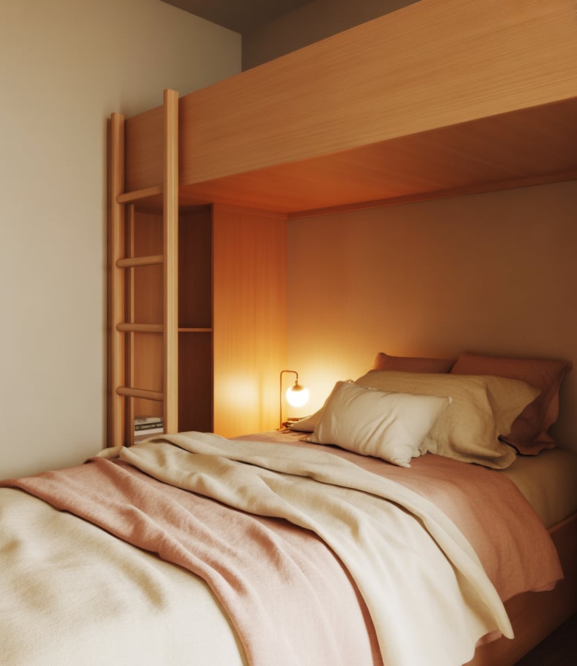 In shared spaces, a double loft bed can be a game changer for small rooms, saving space. Wider sleeping surfaces combined with smart storage underneath reduce the need for extra furniture, making the room feel calmer and more open.