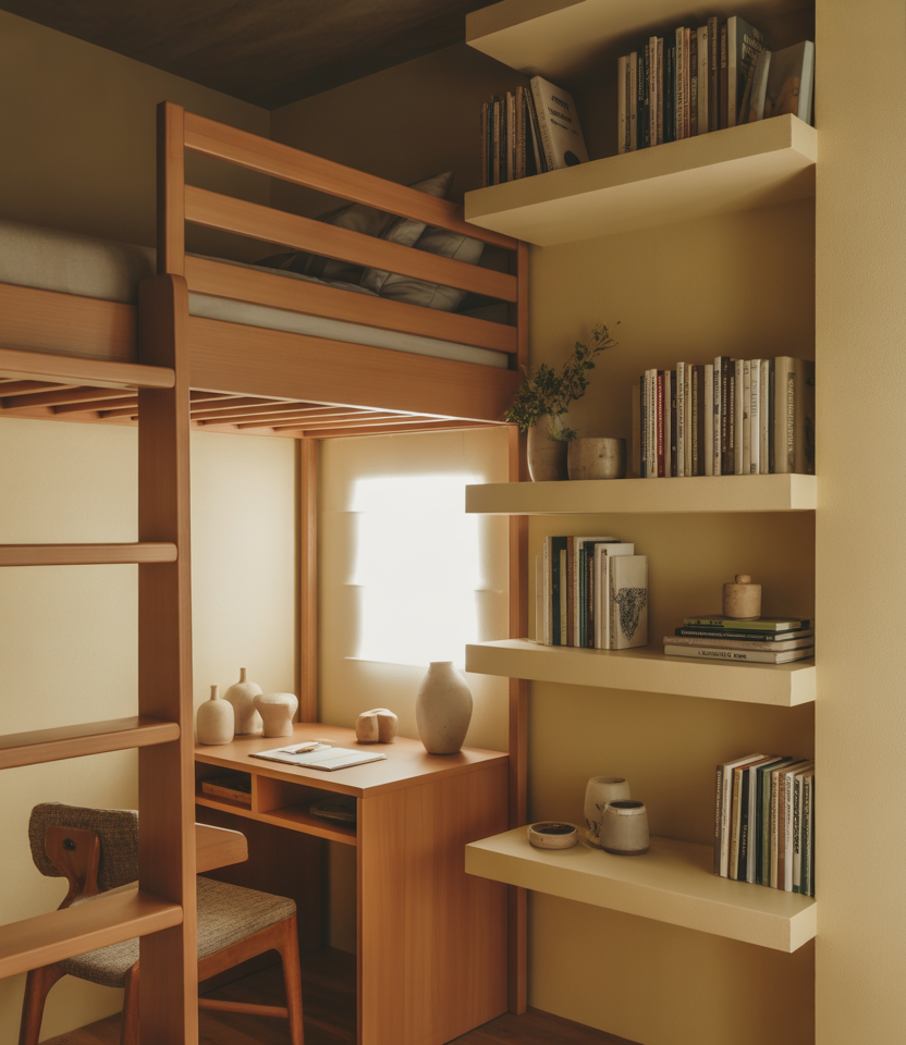 In 2026, loft beds for small rooms are moving away from bulky frames toward lighter, calmer designs. This style focuses on pale wood, low visual weight, and simple lines that help a small room’s space-saving layout feel breathable. It works beautifully in rentals or older homes where every square foot matters, especially when paired with built-in shelving instead of extra furniture.