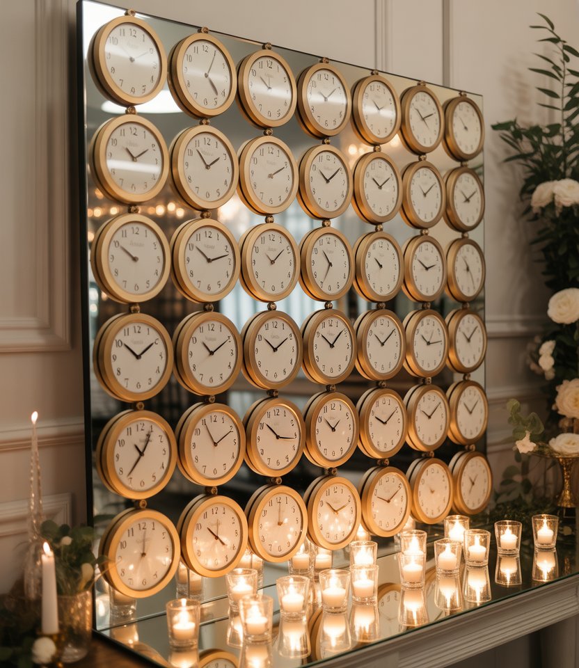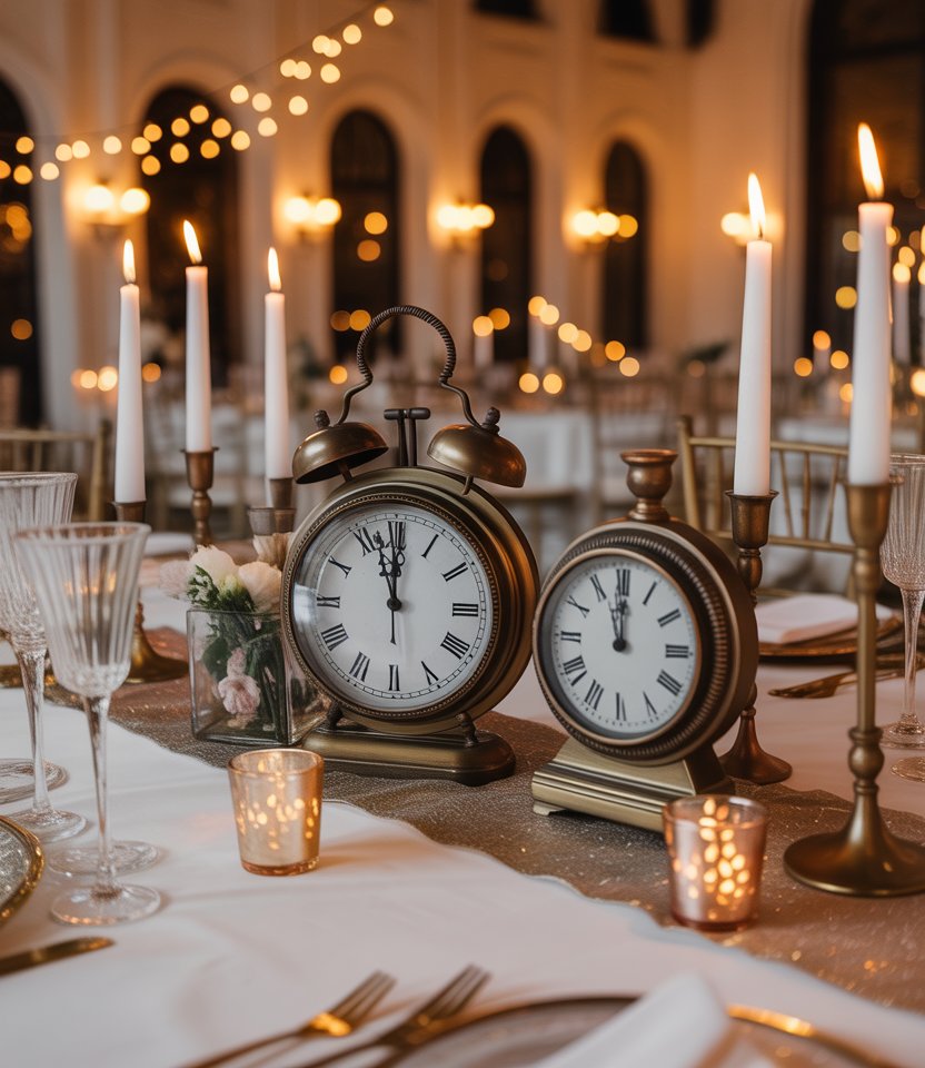 Build your seating chart into an artistic countdown. Numbered escort cards fashioned as clocks guide guests to their tables while reinforcing the theme. Use bold metallic fonts on black or jewel-colored backgrounds. Planners always say tying functional elements into the theme leaves a clean impression.
