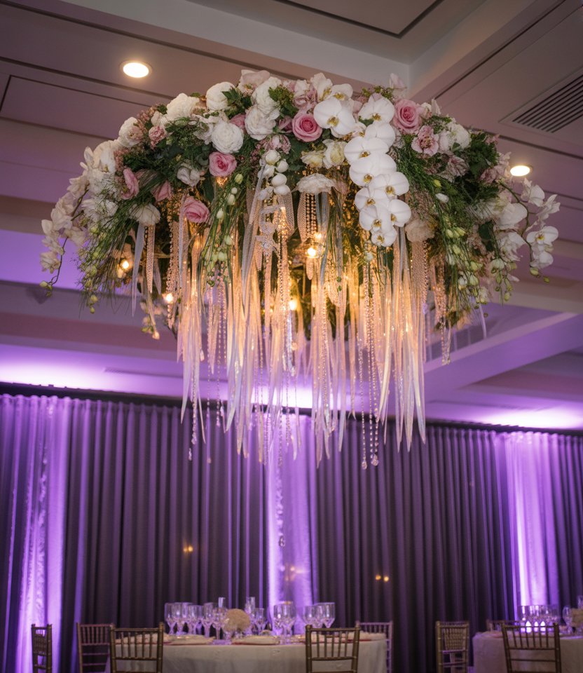Take off from classic bouquets and hang flowers and greenery from the ceiling instead. Mixing orchids or roses with metallic streamers produces an ethereal floating feel. This is quite a daring alternative to centerpieces and brings a luxe and modern vibe to the whole reception.