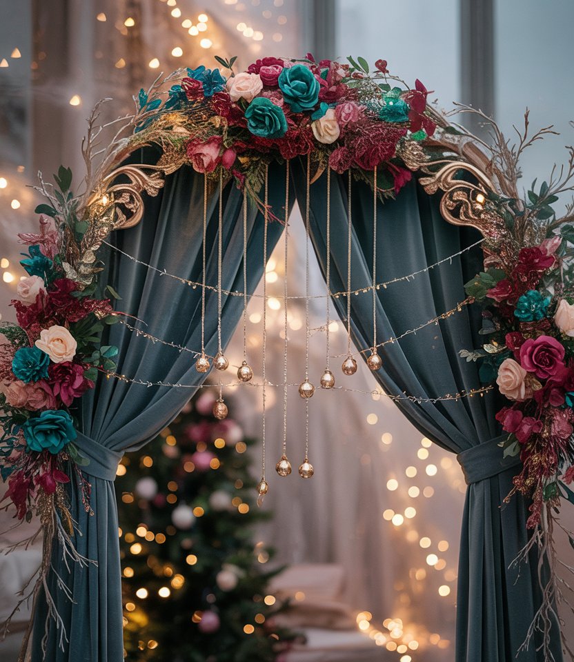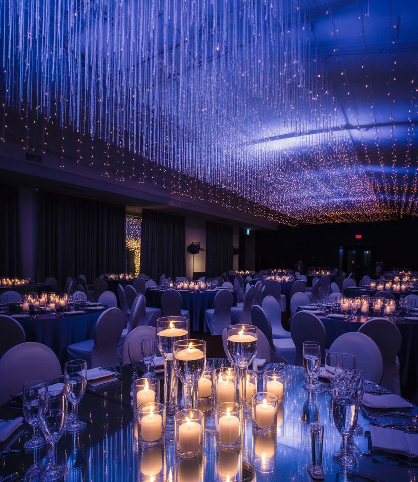 Transform your venue ceiling into a starlit night sky with string lights, fiber optics, or even a projection. This adds a celestial aesthetic complementary to the New Year magic. In unison with dark jewel-toned colors, it creates an atmosphere where romance meets wonder.