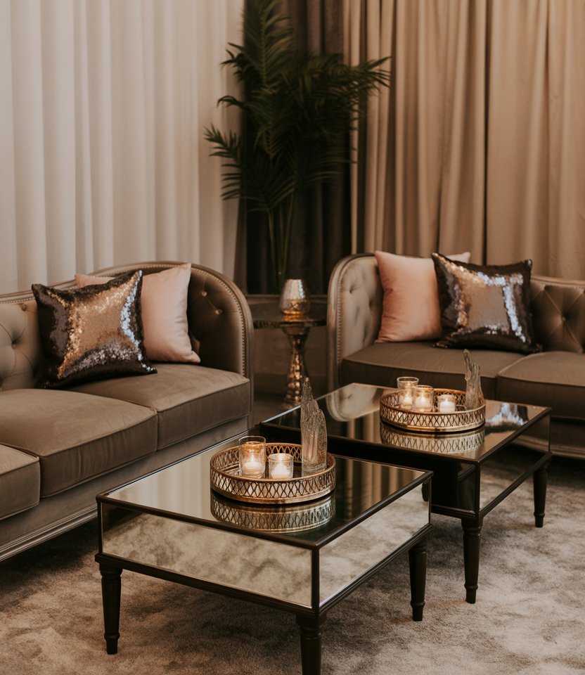 Set up comfy lounge corners for your guests to unwind in between dancing sessions. Incorporate velvet couches, mirrored coffee tables, and puddles of moody light. Add tiny table decors such as votives and trays laden with hors d’oeuvres. These lounges offer a certain amount of respite without veering away from the festive and chic look.