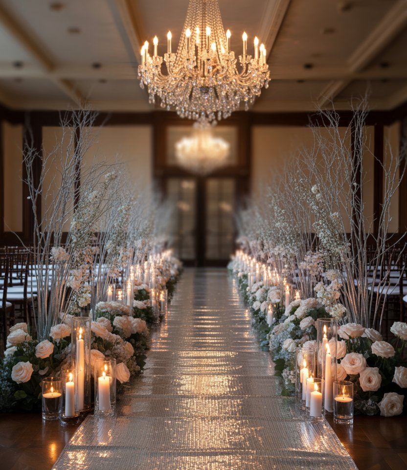 A sparkling sequin or glitter fabric runner will upgrade the ceremony’s entrance from the usual plain aisle. The glimmering path will catch the magic of the moment as the bride walks down, reflecting on candlelight and under the chandeliers. Metallic flowers tucked along the sides or clusters of votives can accompany this for a dramatic glow. This glitzy feature gives the aisle as much prominence as your centerpieces and creates a moment that sets the tone for the entire celebration. Many planners point out that bold touches such as these guarantee unforgettable first impressions.