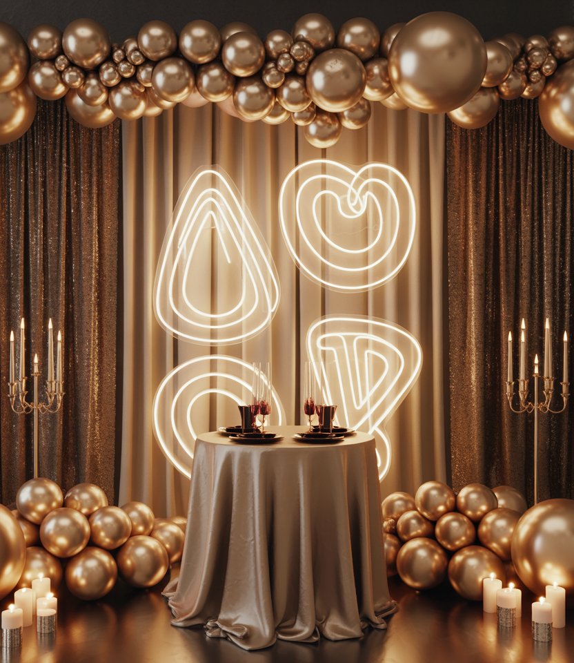 For a fun twist on your décor, commission a neon sign. Whether you choose cheeky phrases like “Kiss Me at Midnight” or a glowing monogram of your initials, neon signs make for an interactive focal point that doubles as a photo booth backdrop. Pair it with metallic balloons, votives, or sequined drapery to keep the aesthetic modern and party-ready. Wedding experts like Style Me Pretty often comment that neon instantly jets the vibe sky-high, making it ideal for couples looking for a chic youthful aesthetic.