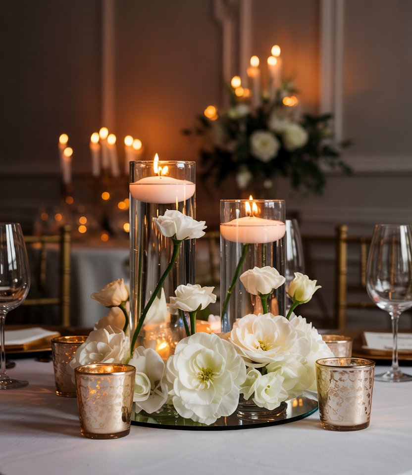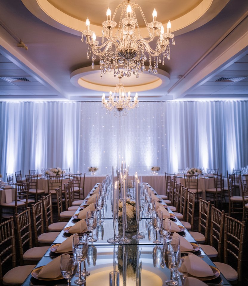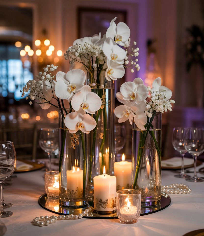 Use tall glass vases, floating candles, and lush floral centerpieces highlighted by gold to elevate the tables. The mirrors below the arrangements reflect and multiply the glow of the candles. As Preston Bailey suggests, the centerpieces ought to match the grandeur of the event, providing guests with an unforgettable visual experience.
