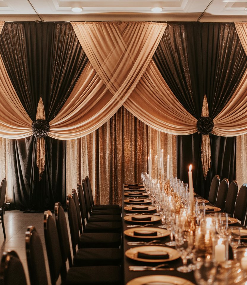 Make a statement in your venue by draping the walls in sequins from floor to ceiling. Whether black, gold, or a jewel tone, sequins immediately say glamorous ballroom. Throw in some moody uplighting to paint the walls into texture and sparkle. This maneuvre works wonders when layered in ballrooms that can feel stark without decoration. Decoration ideas like these making it very easy to dub your photos a hit while setting an upbeat backdrop to immerse your party; in other words, a midnight soiree.