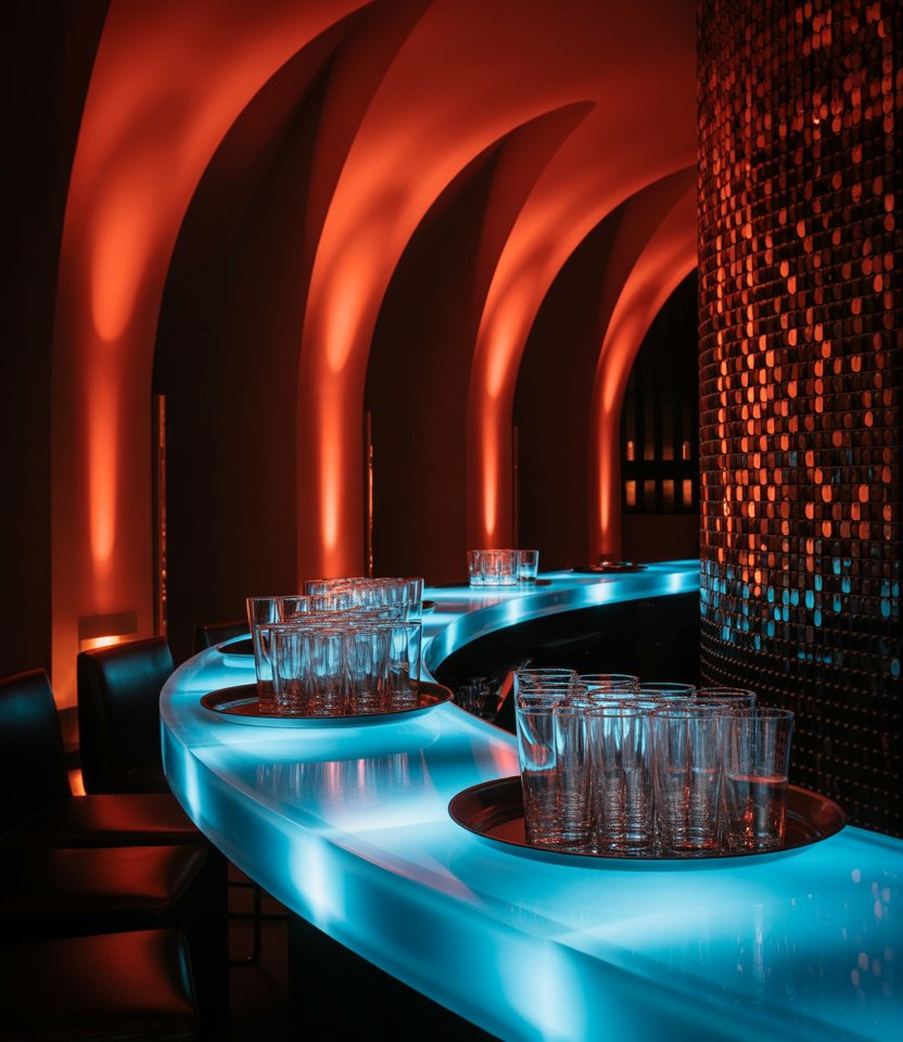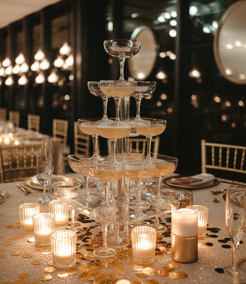 Make your cocktail station unforgettable by keeping it under the theme of fire and ice. Blue LED-lit counters emulate a glow of ice while fiery red uplighting or clusters of candles provide the former. Signature cocktails with names carrying you through countdown moments, such as ‘Eleven O’Clock Twist’ and ‘Midnight Kiss,’ keep you returning to the theme. Guests are inevitably drawn to unusual drink stations; this place is also decor, adding visual interest and interactive energy embodying the festive dichotomy of New Year’s Eve: cool elegance and burning celebration.