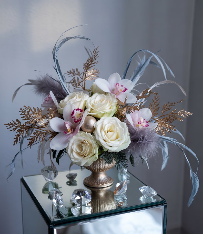 Keep your bouquet and flowers classy yet seasonal. Combining white roses, orchids, or calla lilies with metallic leaves or feathers will create a winter look that is equally festive and chic. Jeff Leatham often suggests mixing natural blooms with shiny accents for added drama.