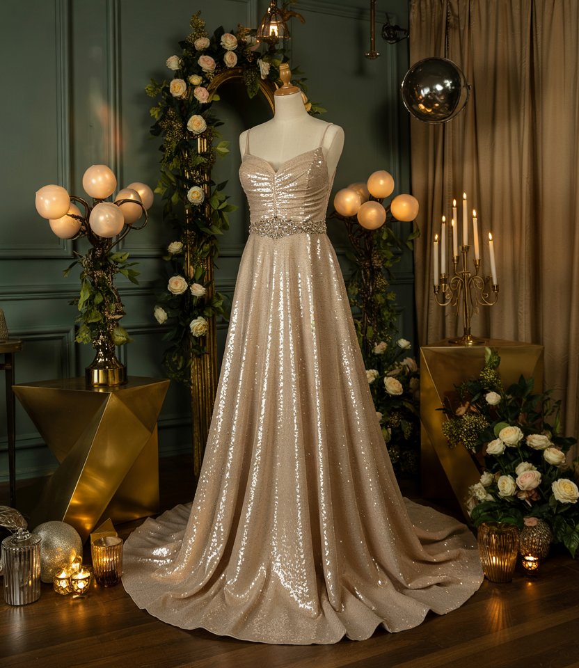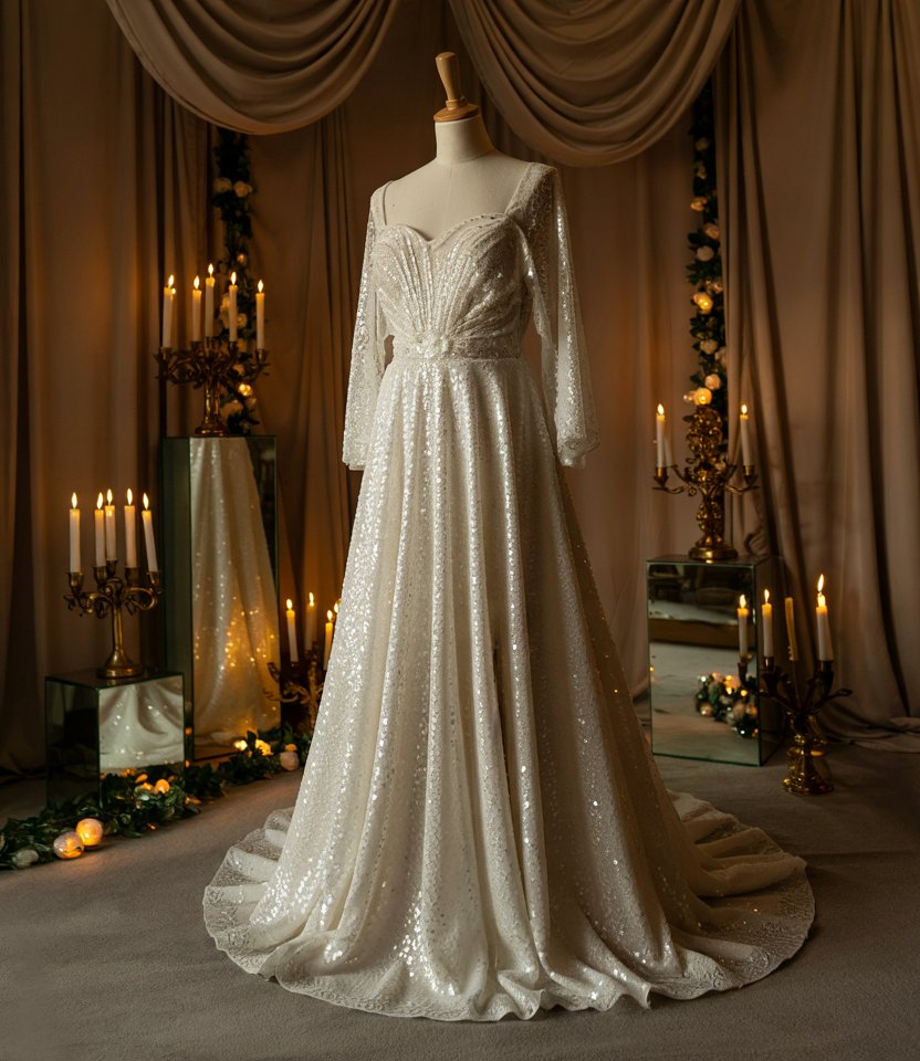 To dress the bride for New Year’s Eve, think along the lines of a sequin gown, a beaded bodice, or an outfit imbued with shimmer. Entertainingly chic, the bride being all glammed-up can then flash over a party dress for the countdown.