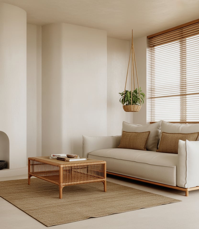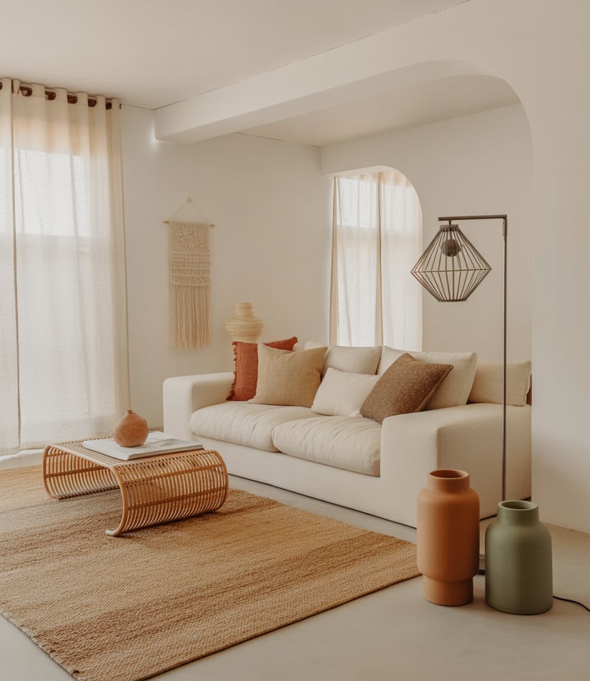 Inject Boho bits of woven texture, macramé, rattan chairs into a strict minimal structure. Use lightly-lathering to retain clean space. This hybrid paves the way for a Boho-minimal aesthetic, an up-and-coming style forecast for 2026.