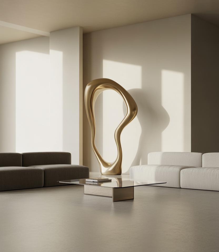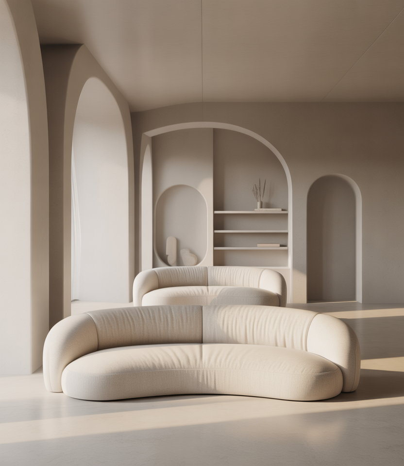 Offset rigid minimalism with a few soft curves from rounded armchairs, curved sofas, and arches. These shapes feel organic without clutter. The contrast of curved shapes to clean space gives an inviting feeling with a little edge of modernity.