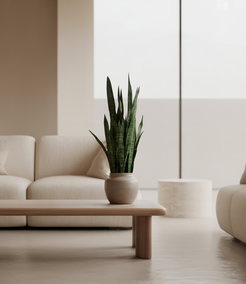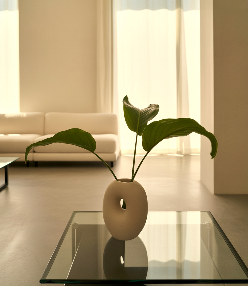 Bring nature softly into minimalism: a single sculptural potted plant or stem in a vase. Avoid overfilling with greenery. The balance of one organic shape against clean lines delivers calm. This idea meshes with earthy, Cozy, or Bohemian touches in an otherwise minimal space.