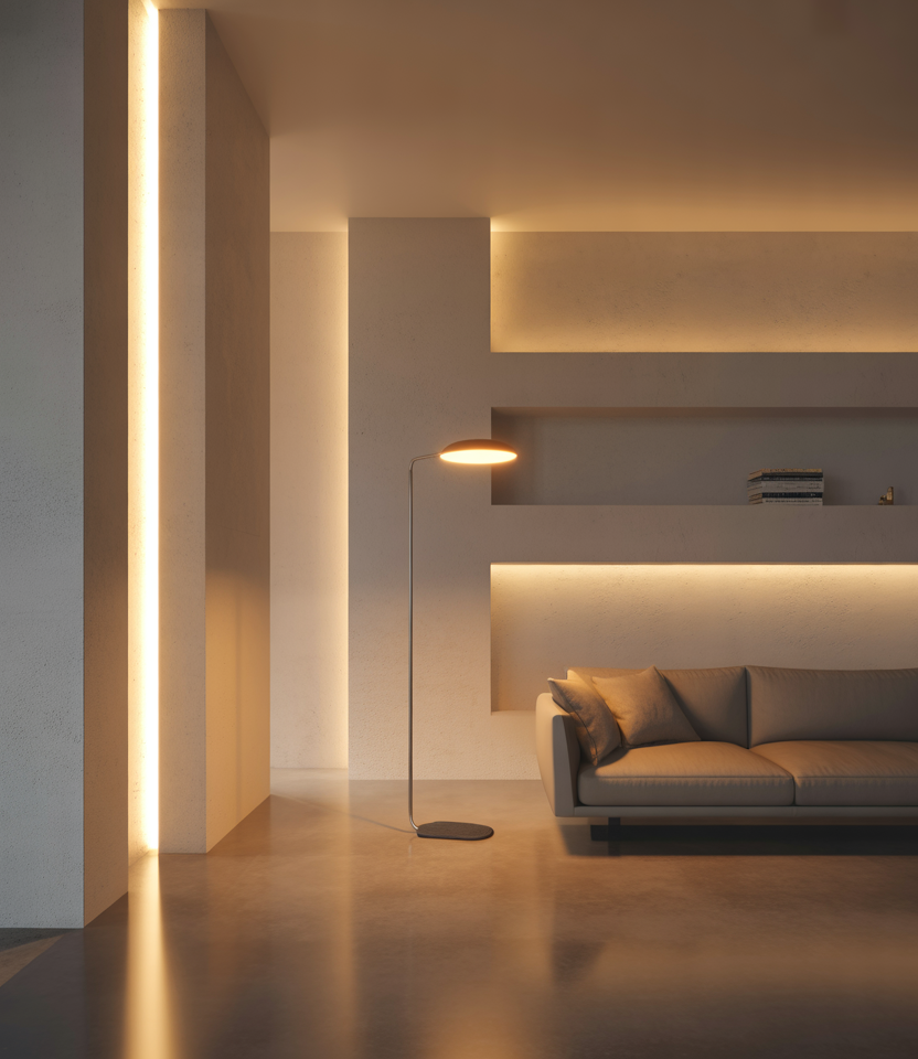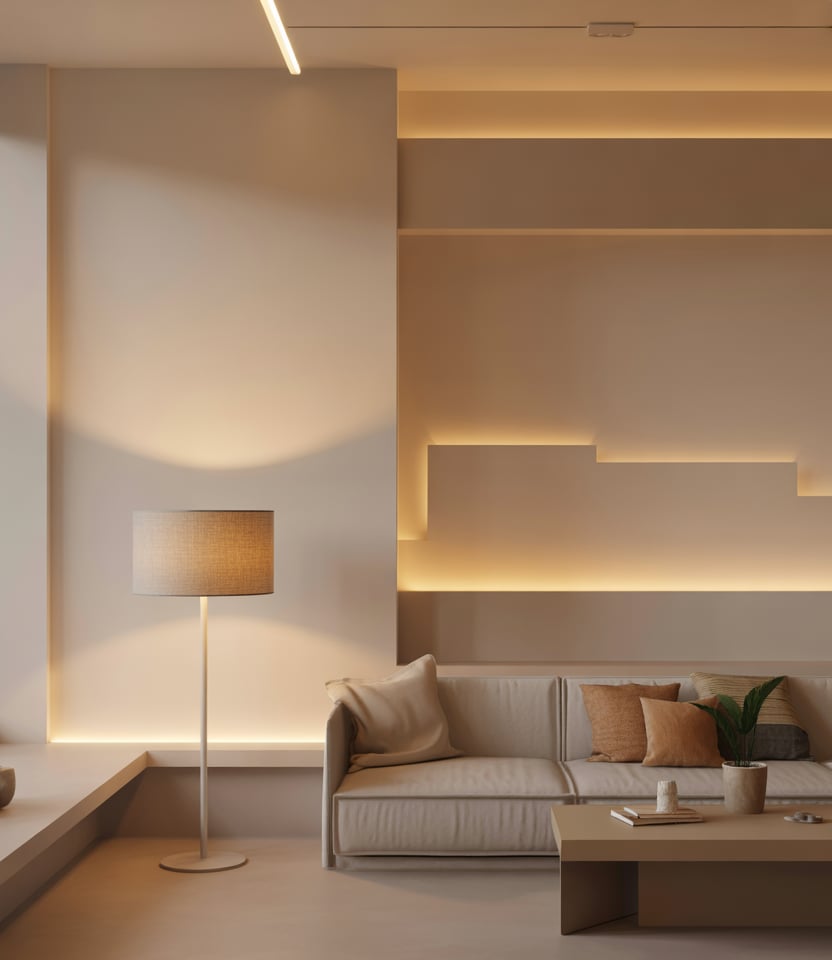 Minimalistic doesn’t mean cold-lay in soft warm lighting using floor lamps, LED strips, and wall washers. Avoid harsh overhead glare; create ambience. This keeps the cozy feel of a minimalist interior.