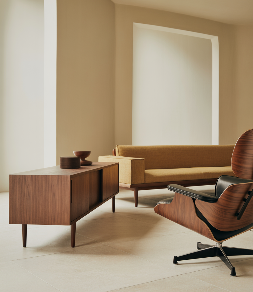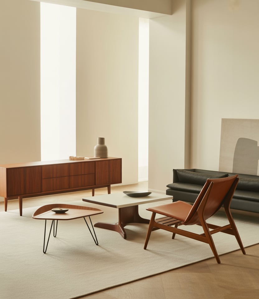 Tie your Mid century elements with minimalist: sedate wood-framed lounge, tapered legs, and organic silhouettes; let the furniture speak sculpturally yet simply. Pair these with neutral or earthy palettes. This is the perfect look for apartments where one desires character minus fuss, with a nod from authors on topics that support this union, such as Mad Men era revivalists and Bright Bazaar.