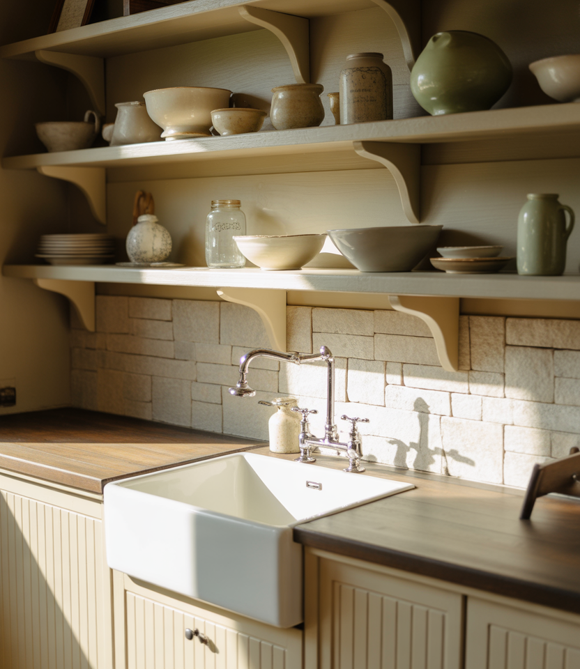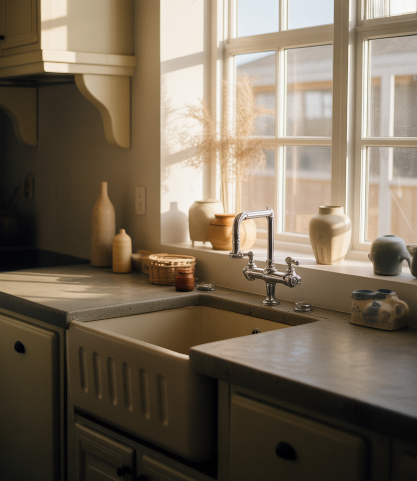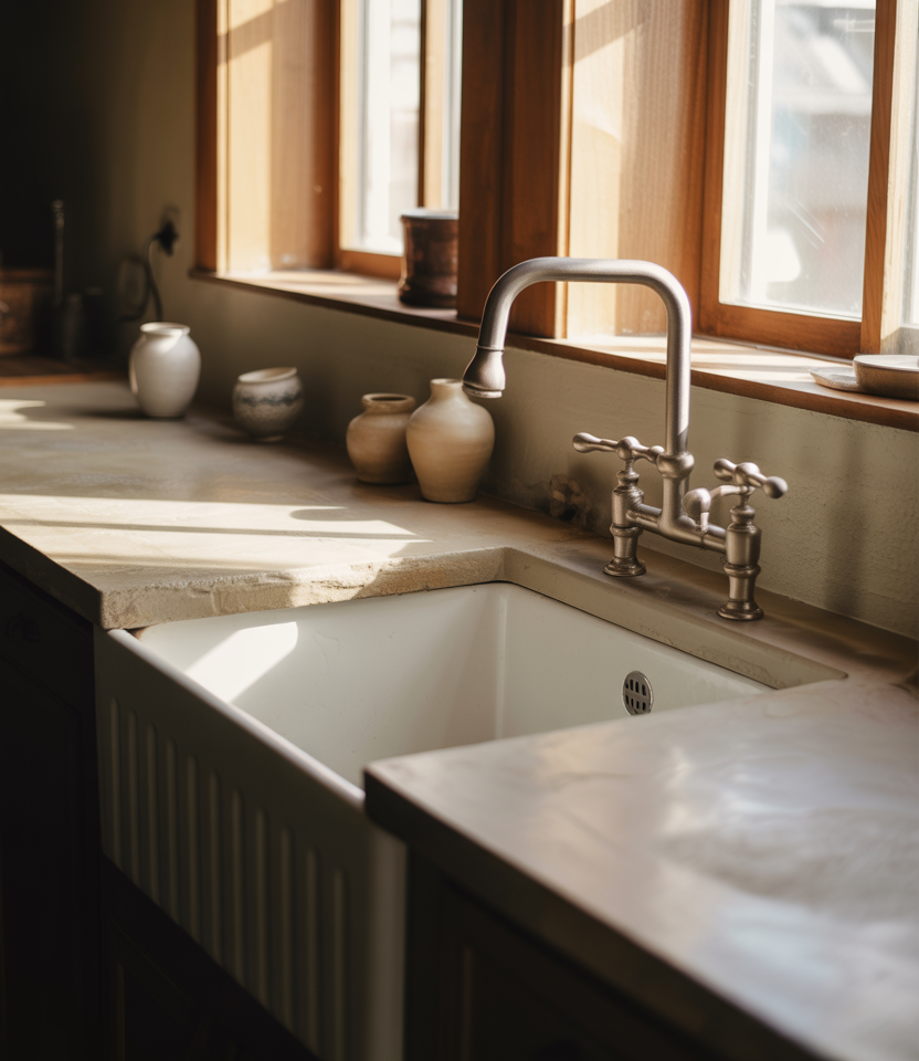 The farmhouse sink remains iconic, but in 2026 it’s framed with intentional counter decor and thoughtful finishes. Apron-front sinks paired with understated faucets feel less decorative and more architectural, grounding the kitchen’s daily rituals.